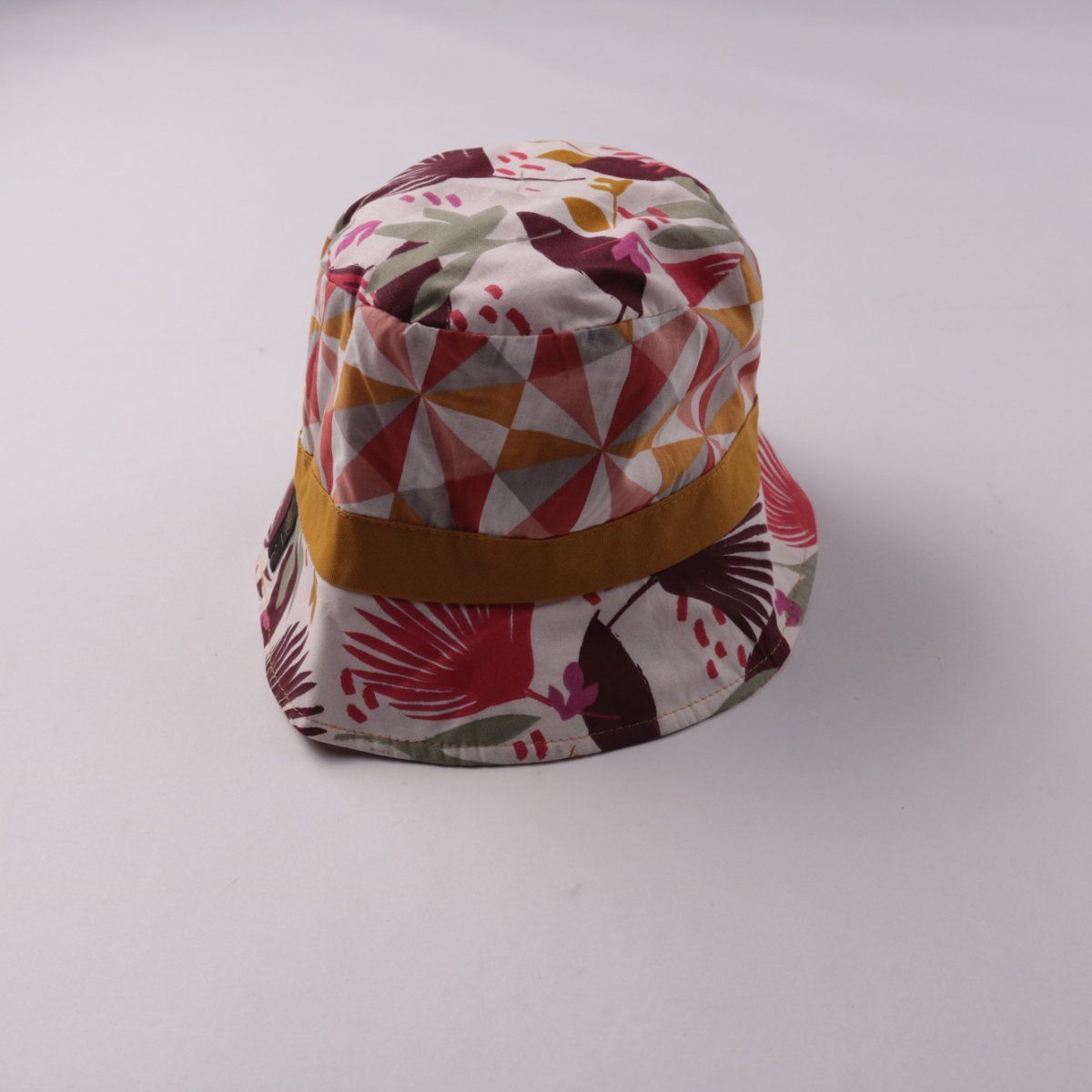 Панама Tout En Tete с ярким геометрическим и цветочным принтом и контрастной лентой по окружности. Подойдёт для прогулок и отдыха в тёплую погоду, защищая голову от солнца. Лёгкий хлопковый материал хорошо дышит и комфортен в носке.