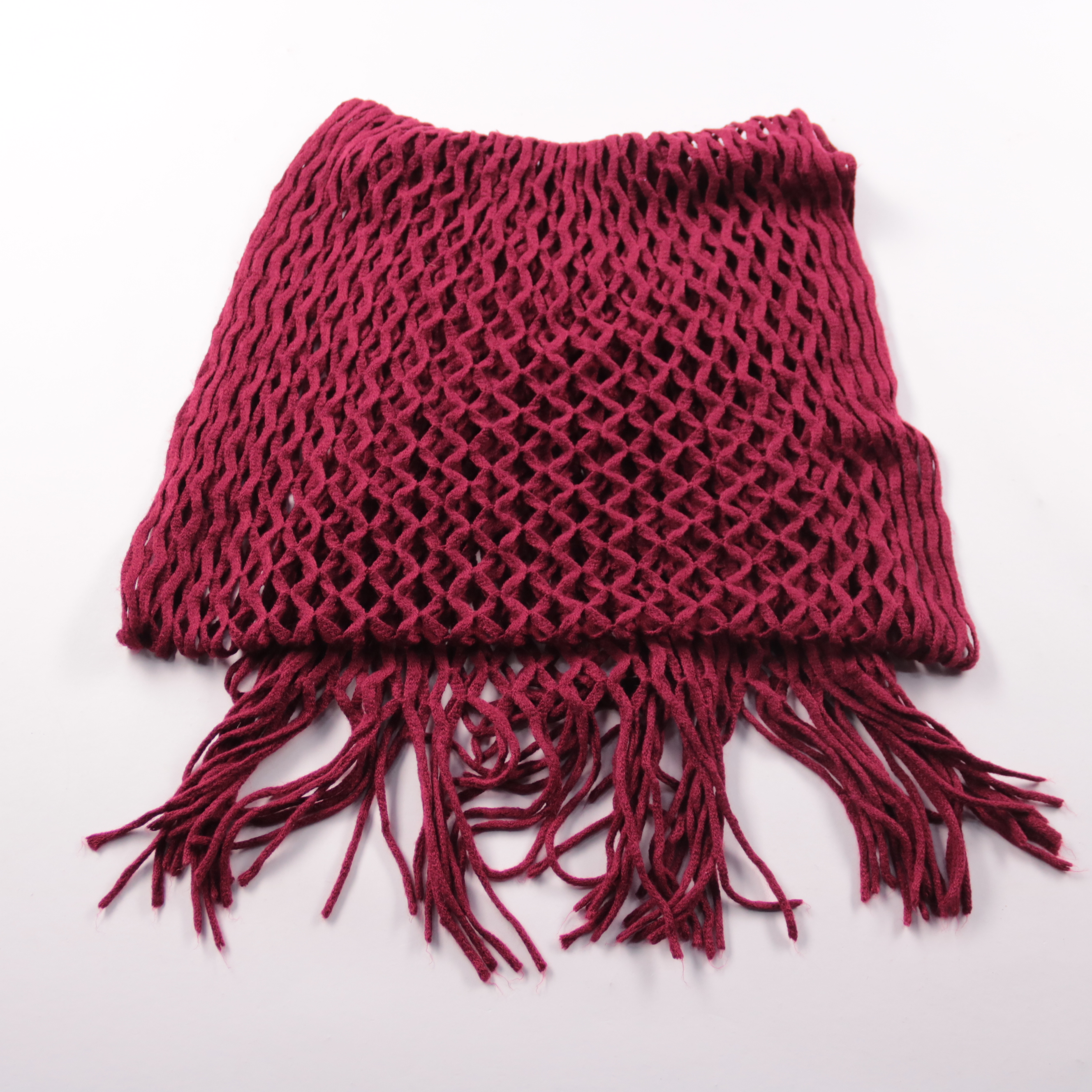 Вязаный шарф-сетка с бахромой в бордовом цвете, подойдёт для прогулок и повседневных образов в прохладную погоду. Лёгкий и объёмный, удобно драпируется и добавляет фактуры. Благодаря сетчатому плетению хорошо продувается и не перегревает.