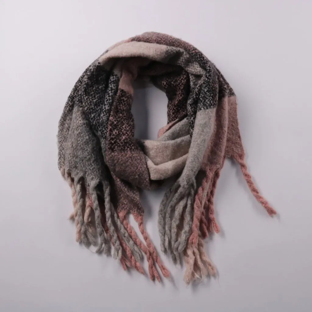 Тёплый шарф в клетку с бахромой, без указания бренда. Подойдёт для повседневных образов в холодную погоду и хорошо сочетается с пальто или пуховиком. Мягкий объёмный материал приятно ложится в несколько оборотов и помогает защитить шею от ветра.