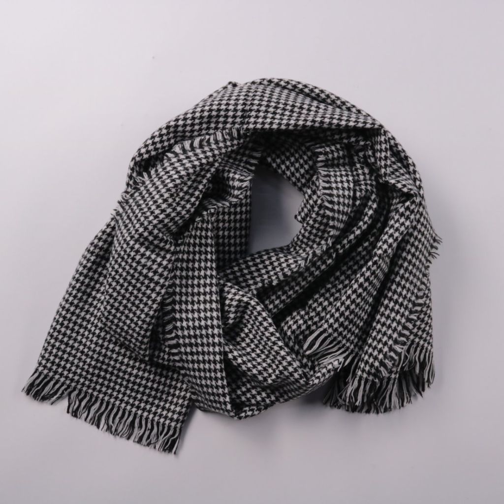 Шарф с узором «гусиная лапка» в чёрно-белой гамме и бахромой по краям. Подойдёт для повседневных городских образов в прохладную погоду и легко сочетается с базовой верхней одеждой.