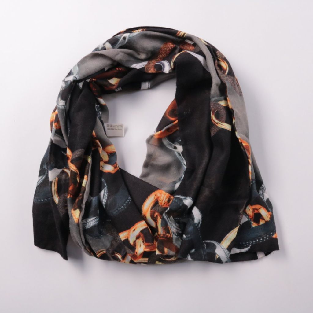 Лёгкий шарф из полиэстера с принтом в виде цепей в чёрно-серой гамме с тёплыми акцентами. Подойдёт для повседневных образов и как акцент к однотонной верхней одежде. Практичен в уходе и быстро сохнет.