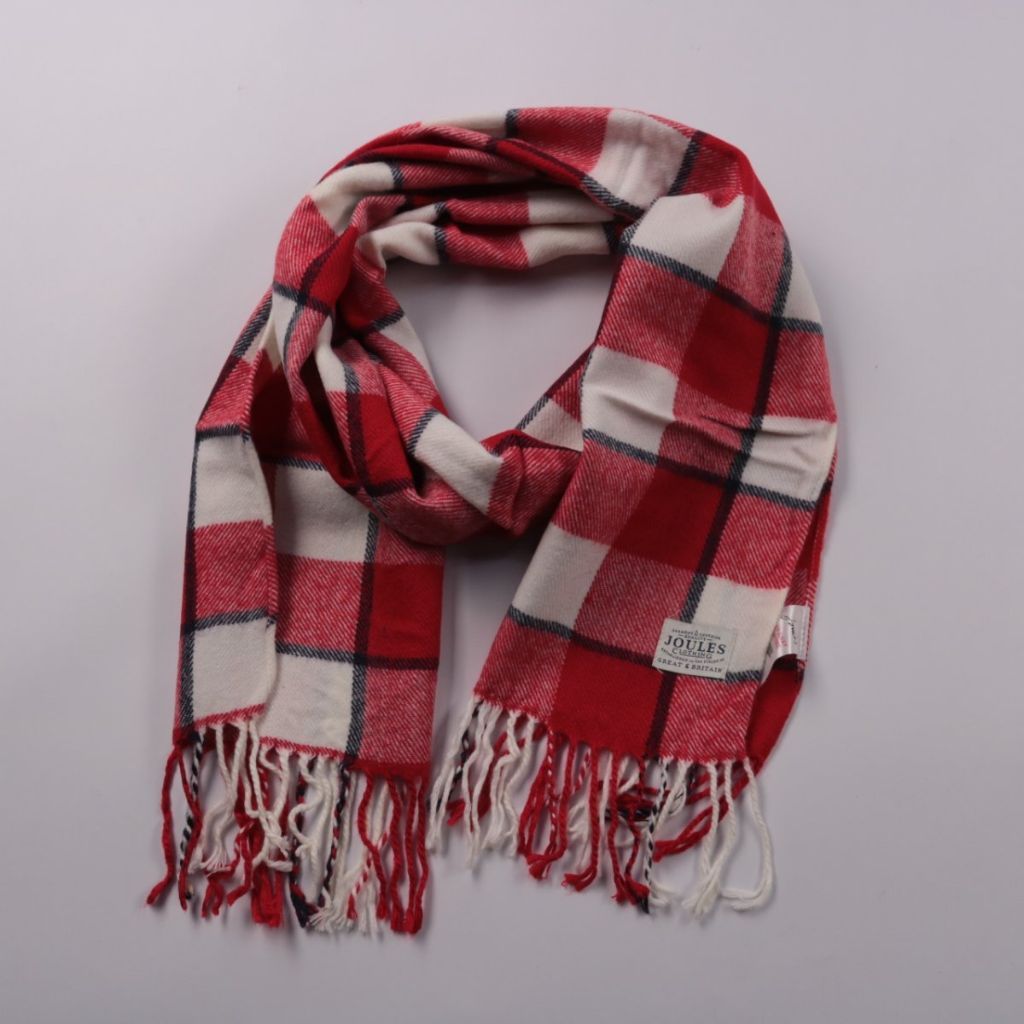 Шарф Joules в крупную клетку с кисточками по краям. Подойдёт для повседневной носки в холодную погоду и легко сочетается с однотонной верхней одеждой. Акриловый материал тёплый и неприхотлив в уходе.