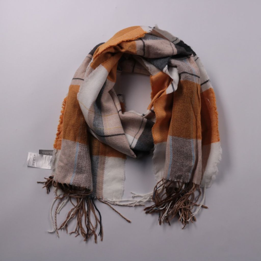 Клетчатый шарф Multiblu с кисточками по краям, выполнен из мягкого акрила. Подойдёт для прогулок и поездок в прохладную погоду, хорошо сочетается с базовой верхней одеждой. Практичный плюс — лёгкий и простой в уходе материал.