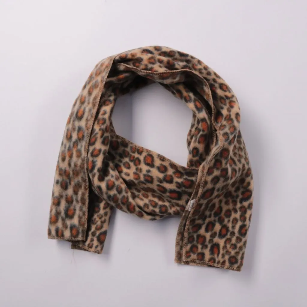 Шарф с леопардовым принтом из мягкого флиса, без бренда на бирке. Подойдёт для повседневных образов в прохладную погоду и легко сочетается с базовой верхней одеждой. Материал практичный и быстро сохнет после стирки.