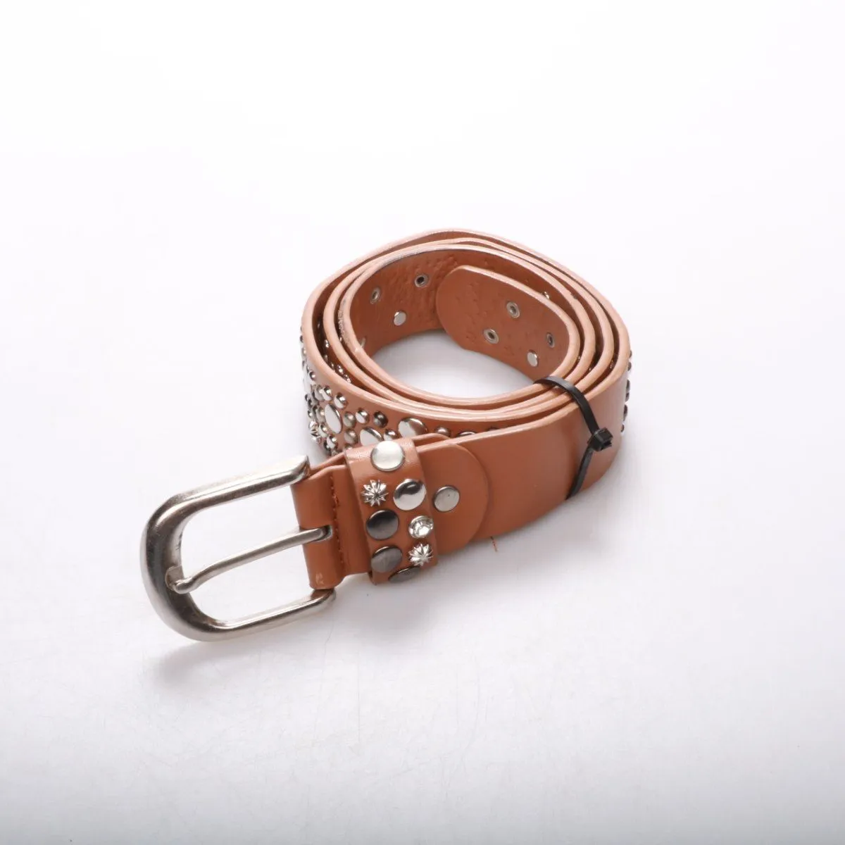 Ремень Gina Benotti коричневого цвета с металлической пряжкой и декором из заклёпок. Подойдёт к джинсам, брюкам или платью, чтобы подчеркнуть талию и добавить образу акцент. Прочный материал и множество отверстий позволяют удобно отрегулировать посадку.