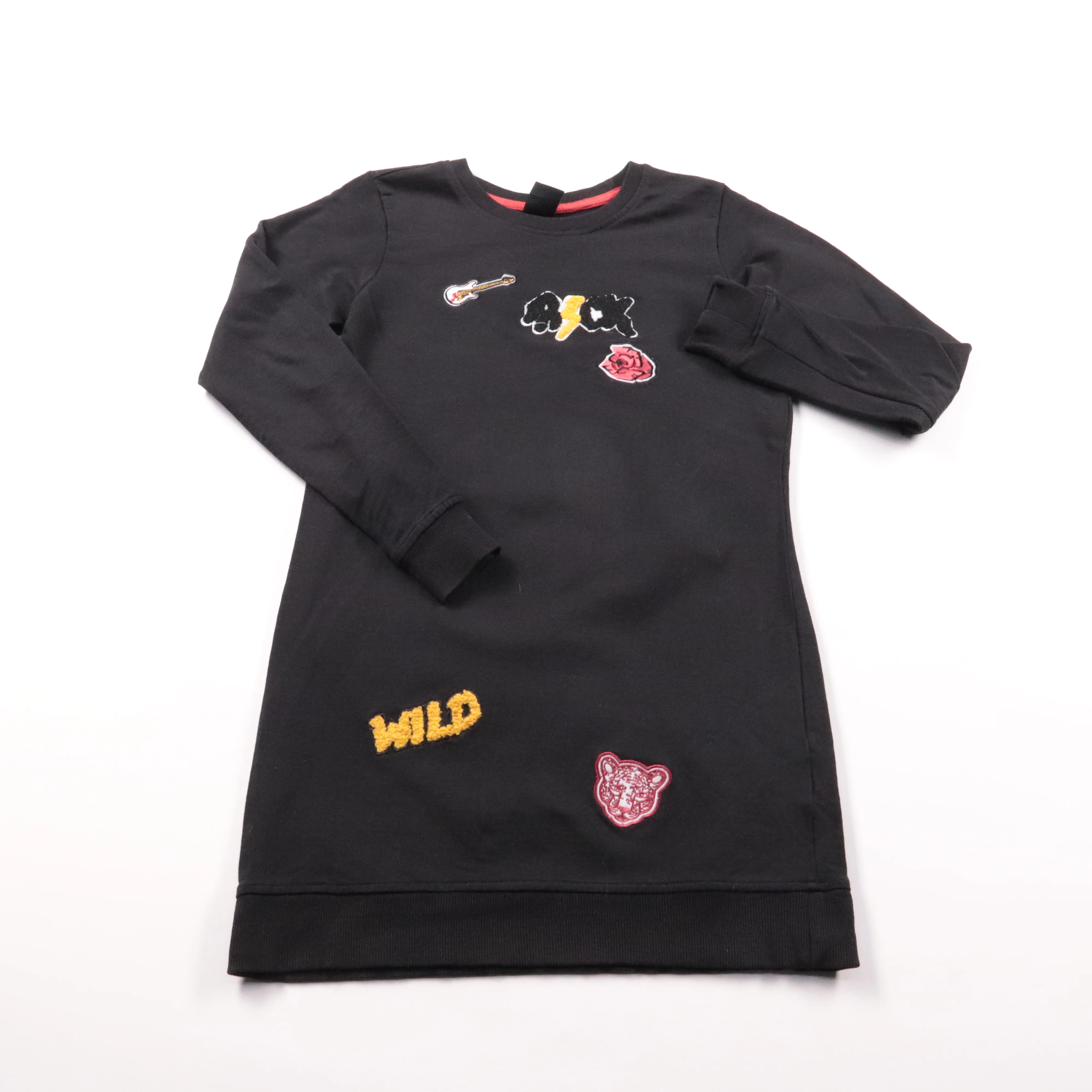Чёрное платье из мягкого хлопкового трикотажа с нашивками и принтами, включая надпись WILD. Подойдёт для школы, прогулок и повседневной носки в любое время года, как самостоятельно, так и с легинсами. Длинный рукав и эластичные манжеты делают посадку к...