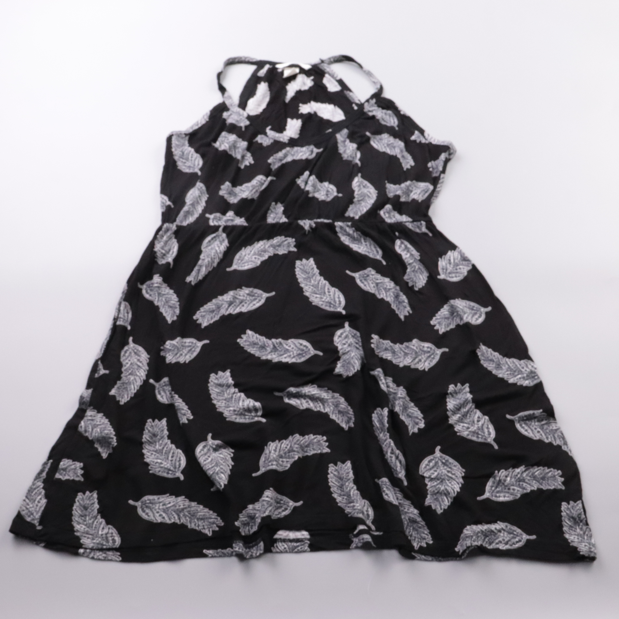Платье H&M чёрного цвета с белым принтом «перья» и перекрещенными бретелями на спинке. Подойдёт для лета и тёплой погоды, на прогулки или праздники. Лёгкая вискоза хорошо дышит и быстро сохнет после стирки.