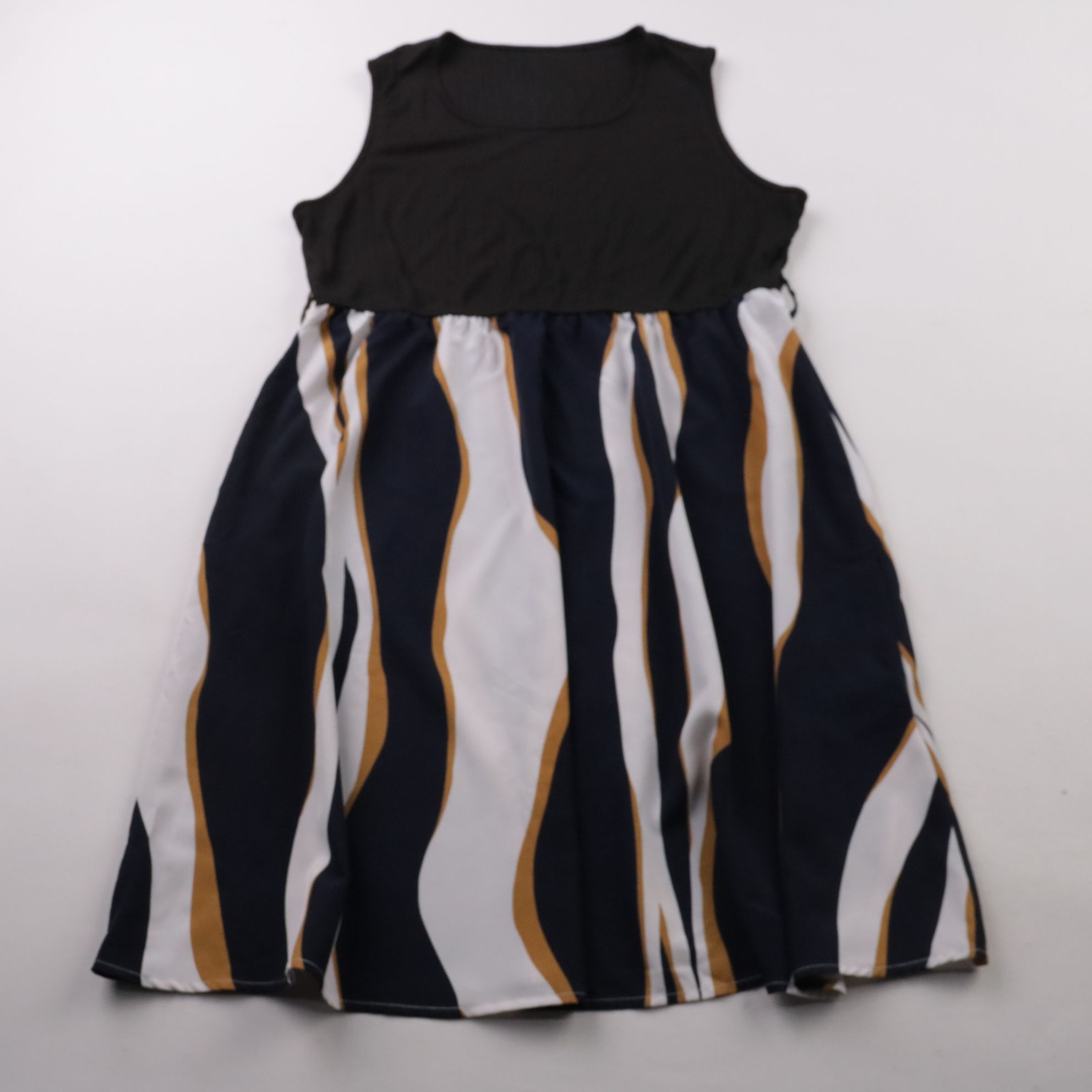 Платье Shein Curve без рукавов, с контрастным верхом и юбкой с волнистым принтом в тёмно-сине‑бело‑горчичных оттенках. Подойдёт для прогулок и праздников в тёплую погоду. Лёгкая ткань почти не мнётся и быстро сохнет после стирки.