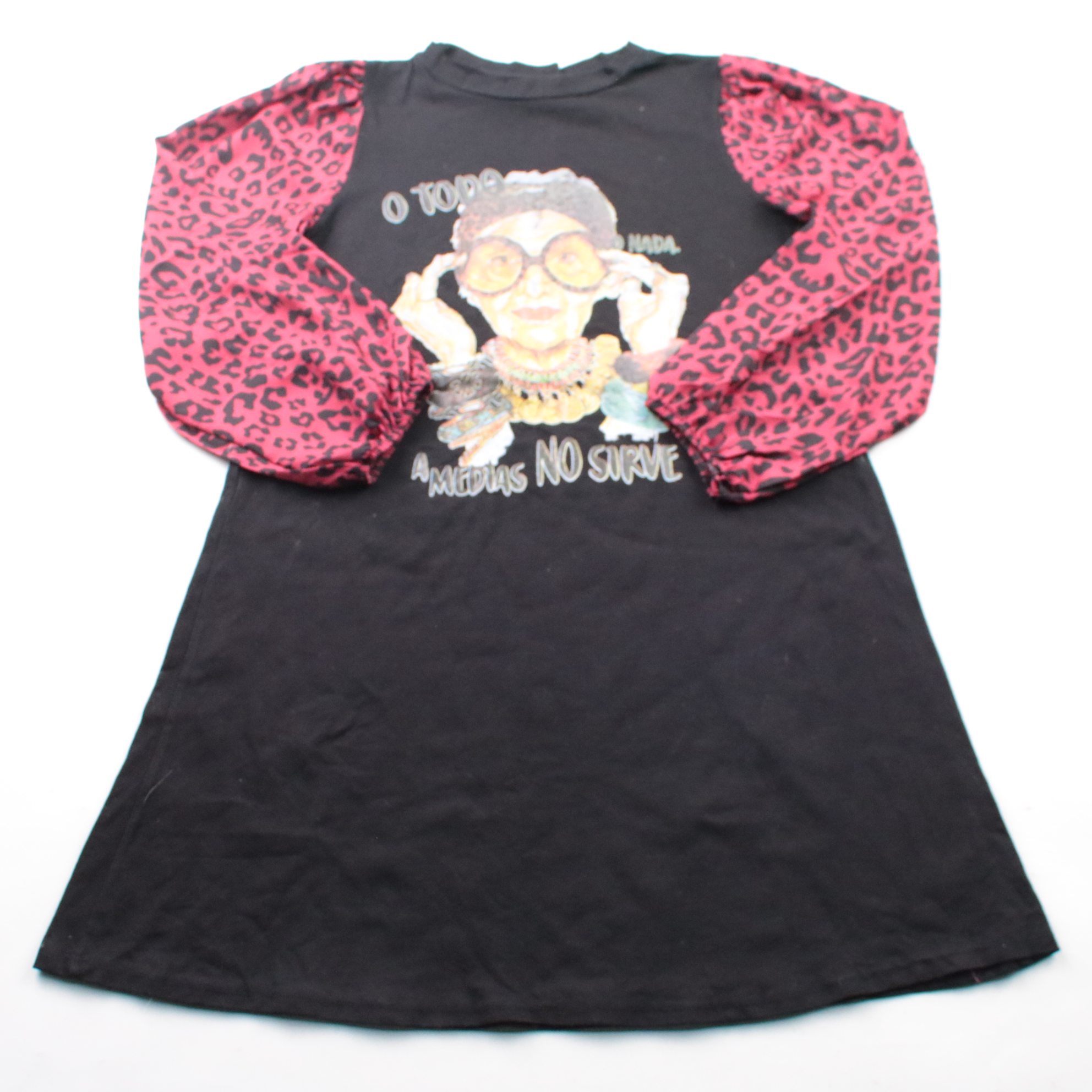Платье для девочки из мягкого трикотажа: чёрная основа с принтом спереди и рукава с леопардовым рисунком. Подойдёт для детского сада, школы и прогулок в прохладную погоду, хорошо сочетается с легинсами или колготками. Практичное: тянется и не сковывает...