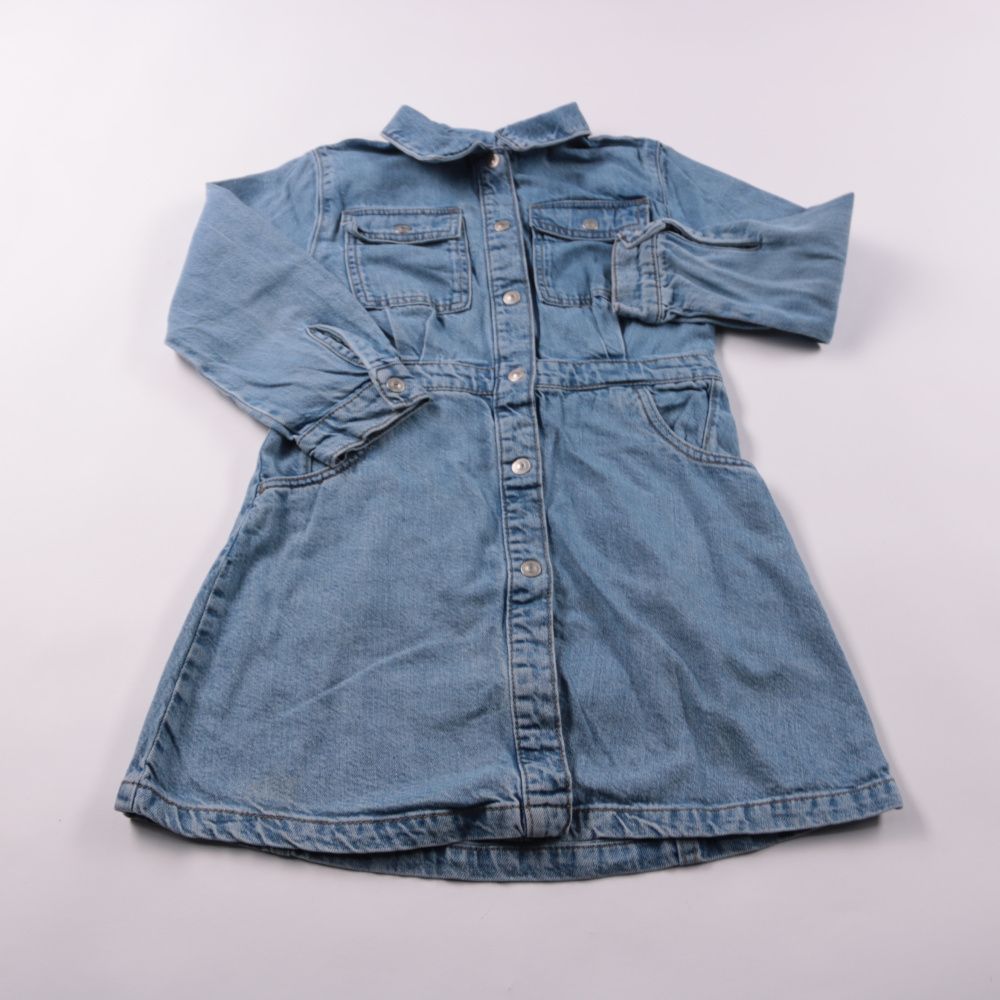 Джинсовое платье-рубашка Zara на пуговицах, с длинным рукавом и накладными карманами на груди. Подойдёт для школы и прогулок в демисезон, удобно носить с колготками или леггинсами. Плотный деним хорошо держит форму и не требует сложного ухода.