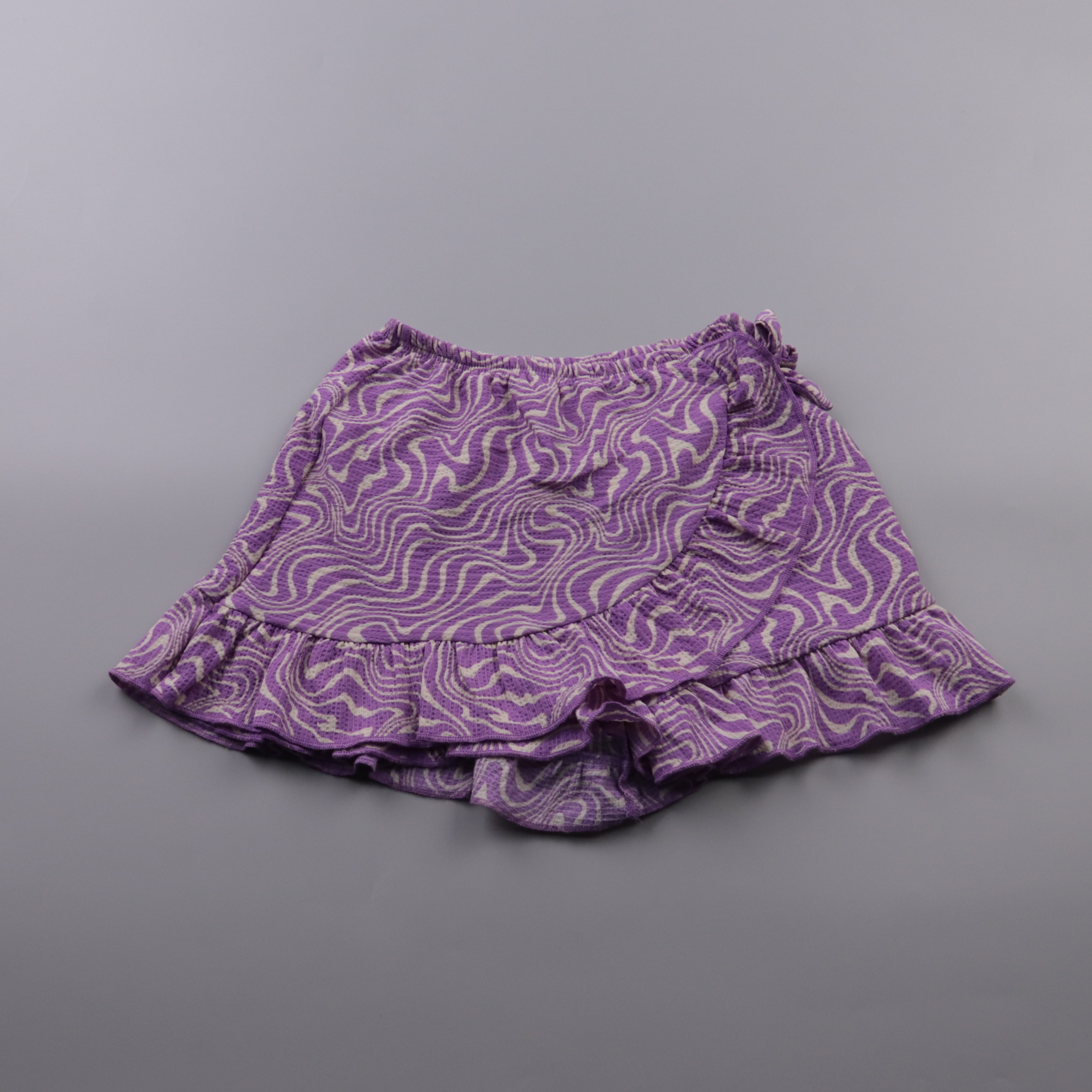 Юбка WE для девочки с воланами и завязками на талии, выполнена в фиолетовом цвете с узором. Подойдёт для тёплой погоды, прогулок и повседневной носки. Эластичный пояс комфортно садится по фигуре и не сковывает движения.
