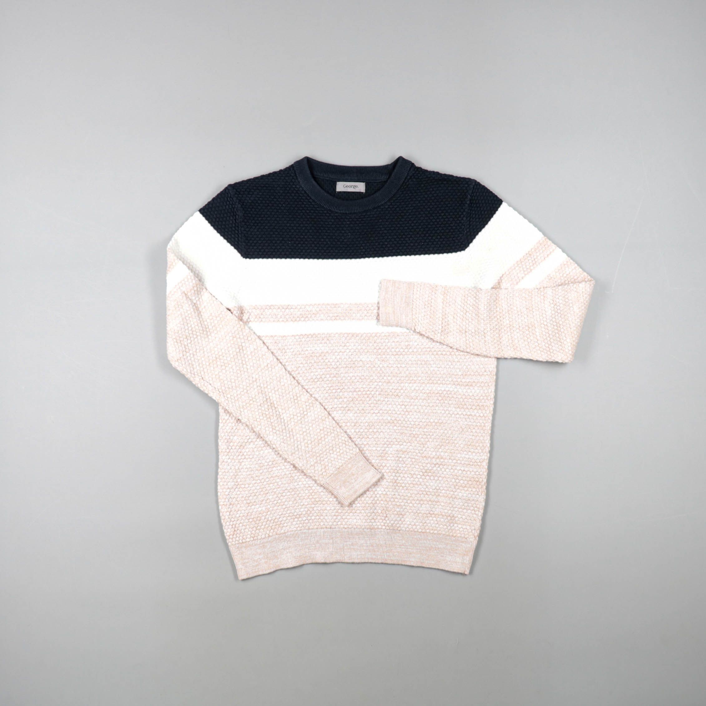 Свитер George для мальчика в полоску: тёмно-синий верх, белая полоса и бежевый низ с фактурной вязкой. Подойдёт для школы и прогулок в прохладную погоду, хорошо сочетается с джинсами и брюками. Мягкий трикотаж и эластичные манжеты помогают свитеру акку...