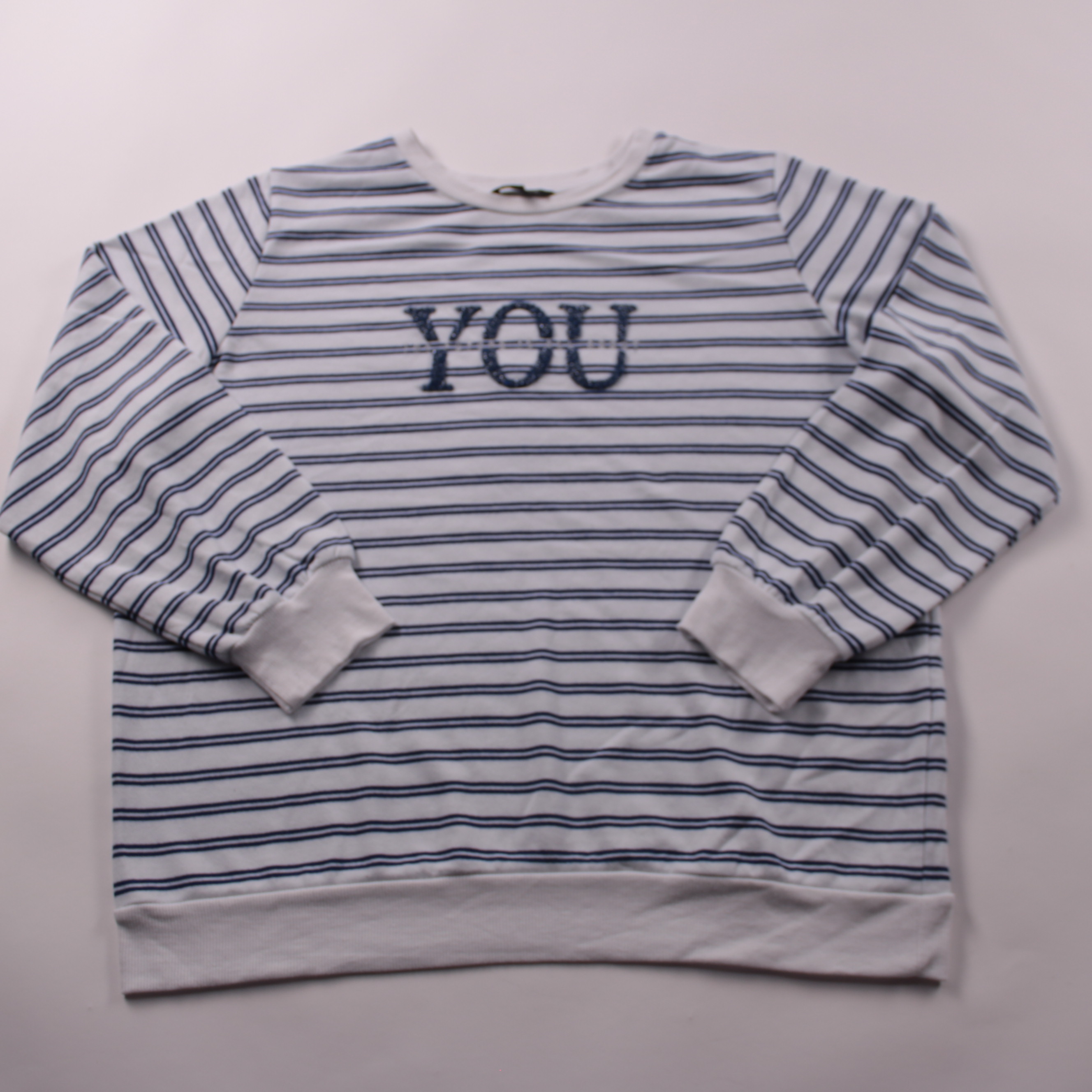 Полосатый свитер M8mode бело-синего цвета с вышивкой «YOU» на груди. Подойдёт для школы, прогулок и повседневной носки в прохладную погоду. Мягкий материал и манжеты на рукавах помогают удобно сидеть и держать форму.