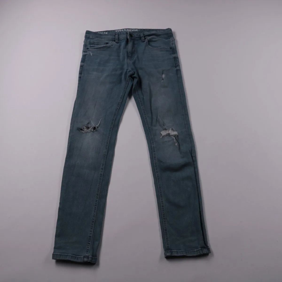 Мужские джинсы Clockhouse Skinny из синего денима с эффектом потертостей и небольшими декоративными разрывами на коленях. Подойдут для повседневных образов в городе и на выход в стиле casual. За счёт добавления эластана ткань немного тянется и комфортнее сидит при движении.