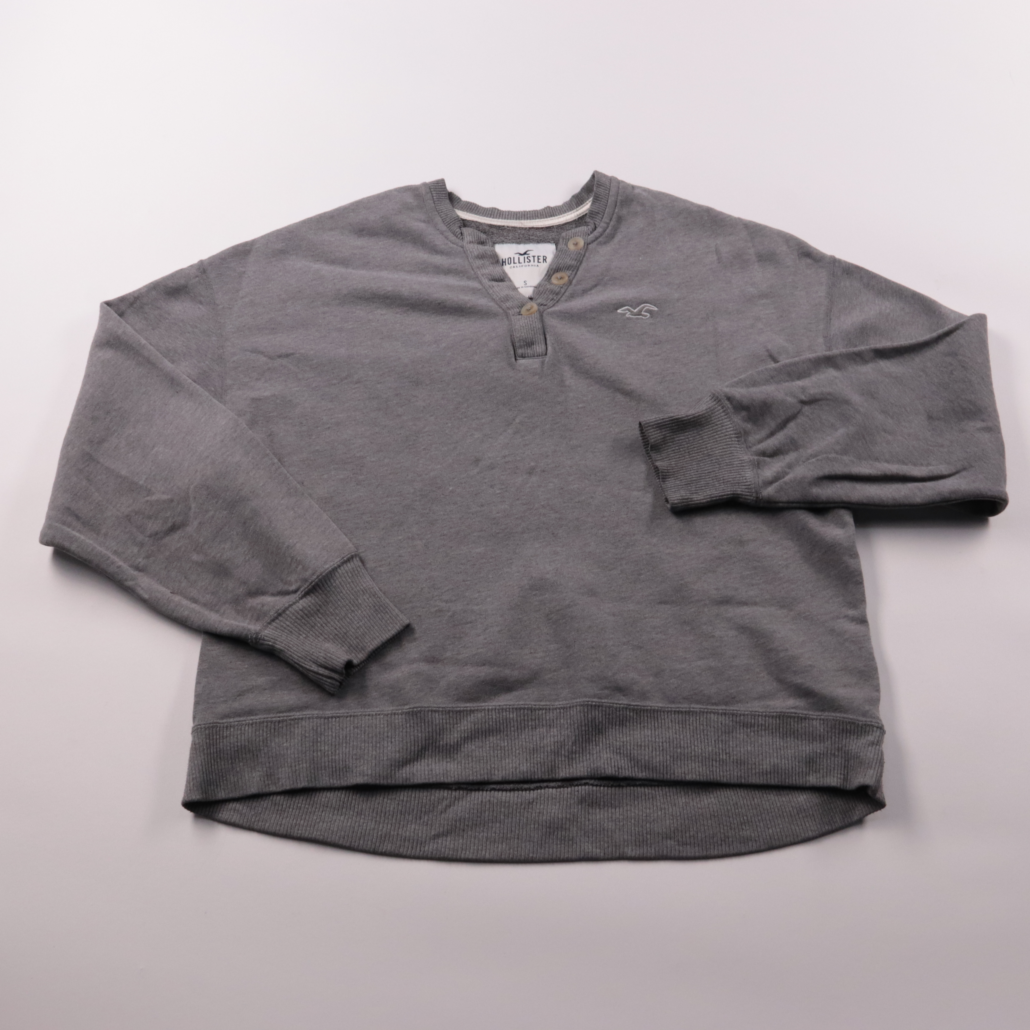 Мужской свитшот Hollister серого цвета с воротником на пуговицах и небольшим логотипом на груди. Подойдёт для повседневной носки в прохладную погоду и как второй слой под куртку. Мягкая ткань и манжеты в рубчик помогают сохранять тепло и держат форму.