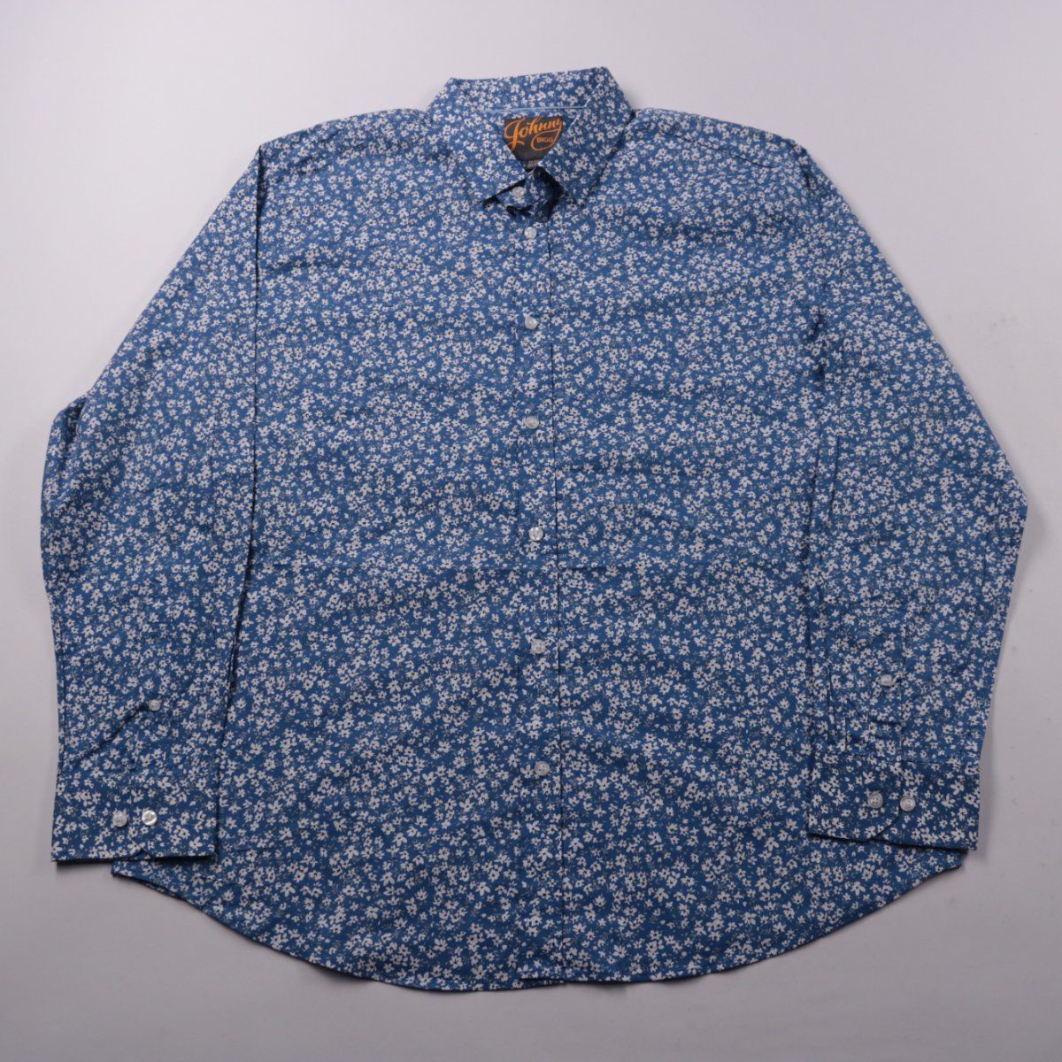 Мужская рубашка Johnny Bigg из хлопка с добавлением эластана, синяя с мелким белым цветочным принтом. Подойдёт для повседневных образов и офиса в стиле casual, хорошо сочетается с джинсами и брюками. Ткань слегка тянется, поэтому рубашка комфортно сидит и не сковывает движения.