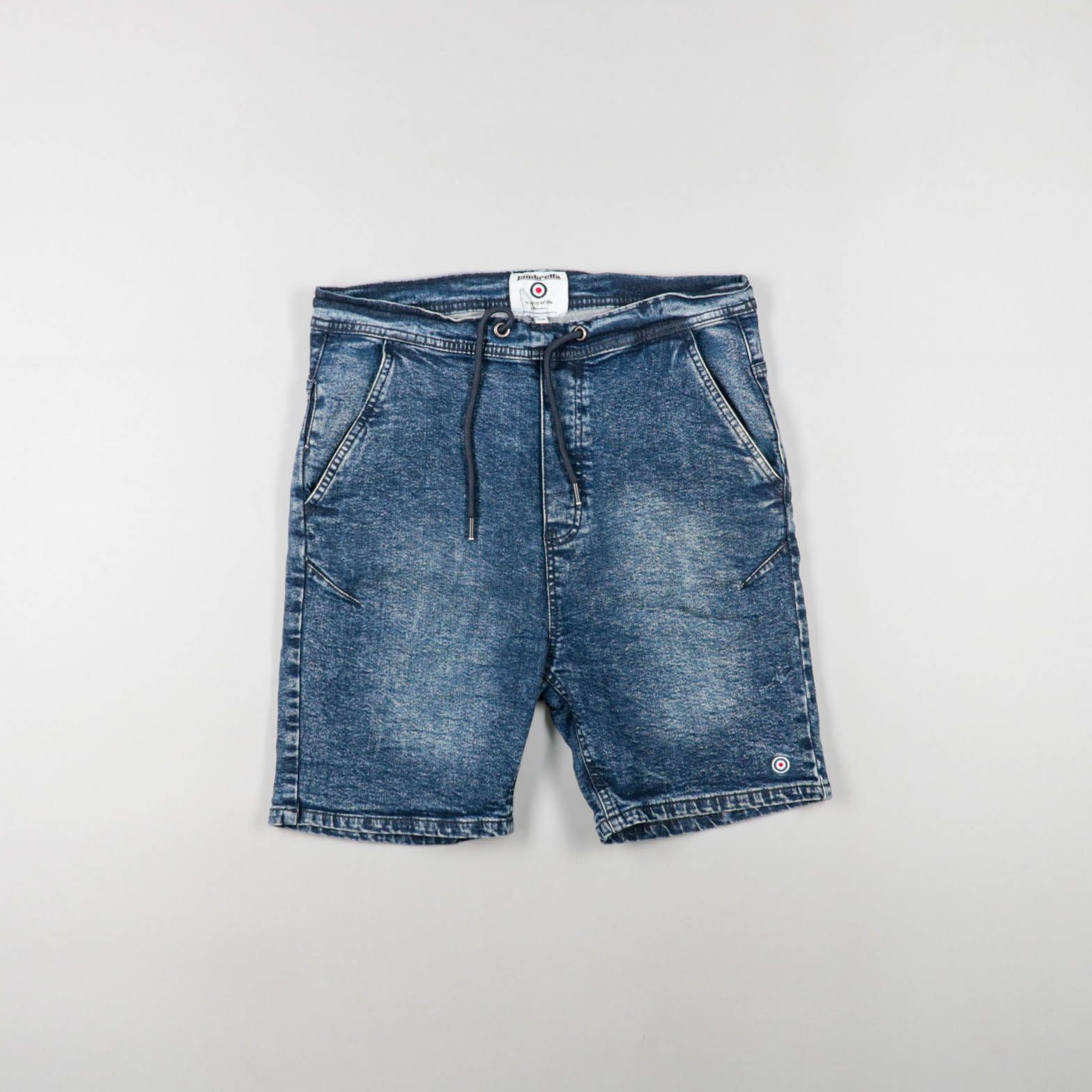 Мужские джинсовые шорты Ineffable синего цвета с эффектом потертости и поясом на шнурке. Подойдут для повседневной носки и отдыха в тёплую погоду, легко сочетаются с футболками и кедами. Удобные карманы и регулируемая посадка на талии делают их практич...