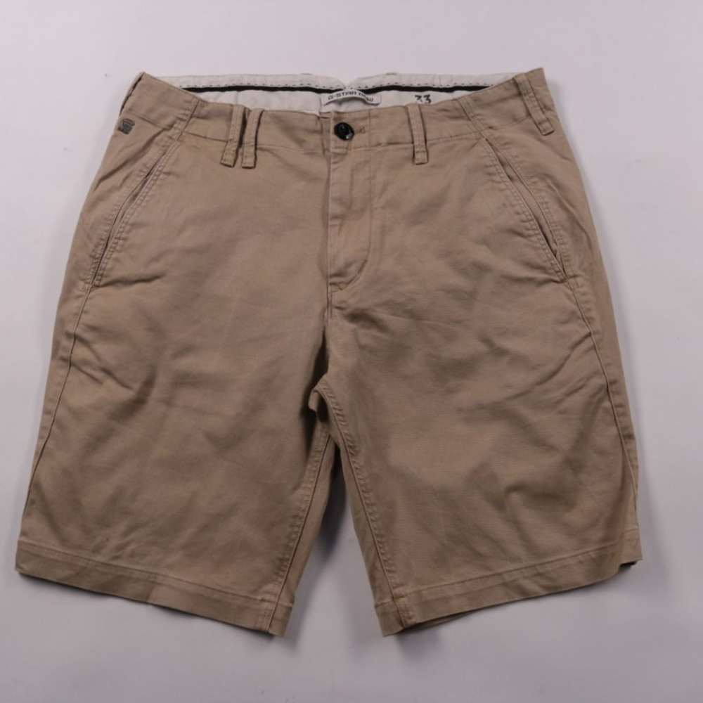 Мужские шорты G-Star Raw в бежевом цвете из плотной хлопковой ткани с добавлением эластана. Подойдут для повседневной носки летом и в тёплую погоду, хорошо сочетаются с футболками и рубашками. Практичны за счёт карманов и удобной посадки под ремень.