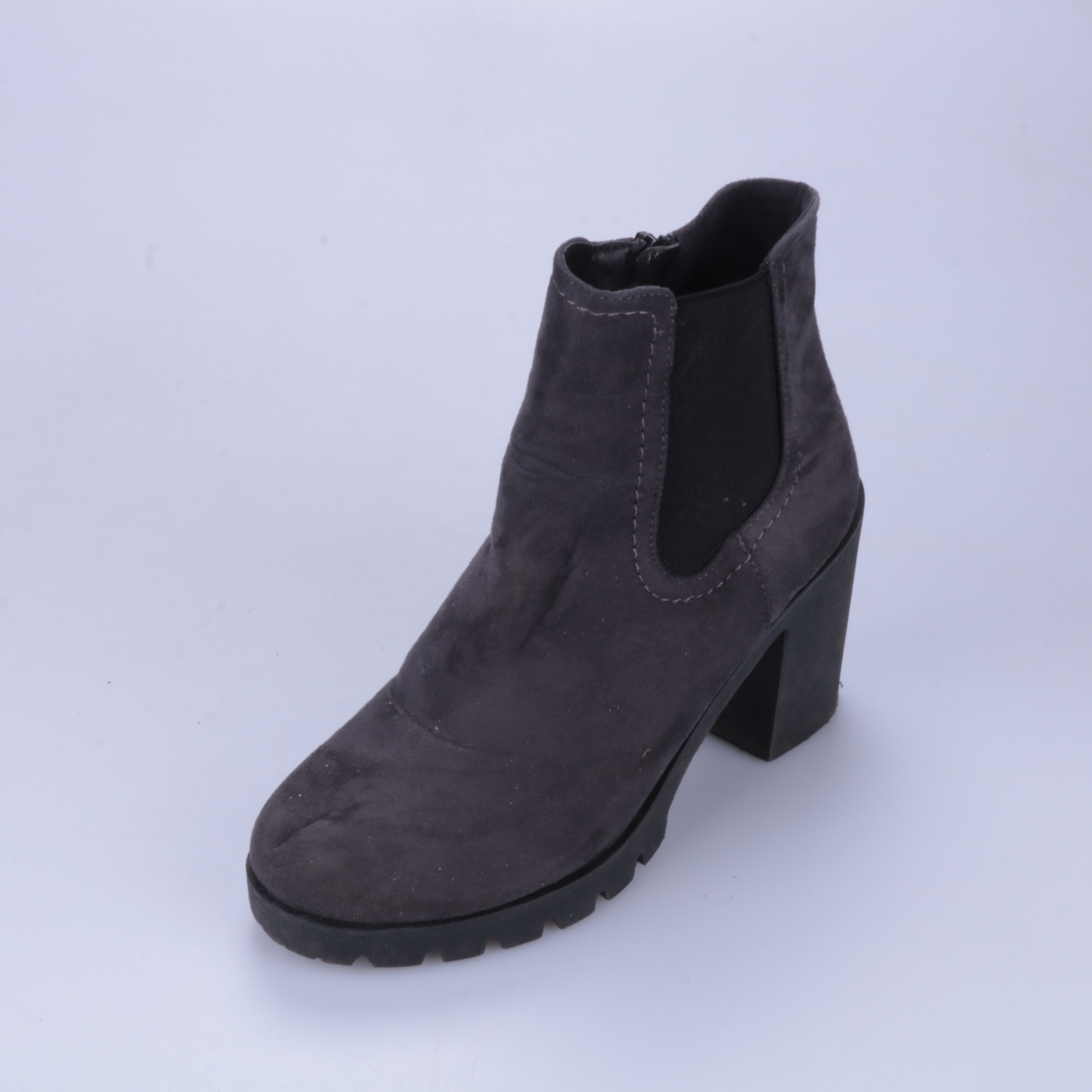 Ботильоны из тёмно-серого материала под нубук на устойчивом каблуке и тракторной подошве. Подойдут для повседневных образов в прохладную погоду, удобно сочетать с джинсами и платьями. Молния сбоку помогает быстро надевать и снимать обувь.