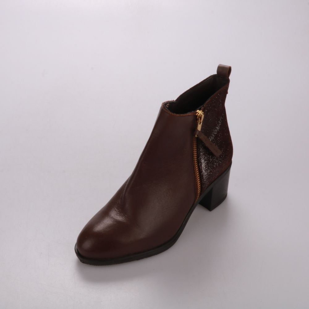Женские ботильоны Amoo из коричневой кожи с вставкой с легким блеском и боковой молнией. Подойдут для демисезона и городских образов с джинсами, платьем или брюками. Устойчивый каблук и удобная посадка делают их практичными для повседневной носки.
