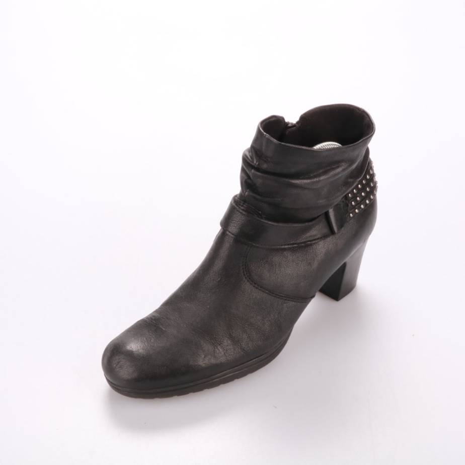 Ботильоны Gabor из чёрной натуральной кожи с боковой молнией и декоративными заклёпками на пятке. Подойдут на каждый день в городе в демисезон — с джинсами, брюками или платьем. Устойчивый каблук и рельефная подошва дают комфорт и хорошее сцепление.