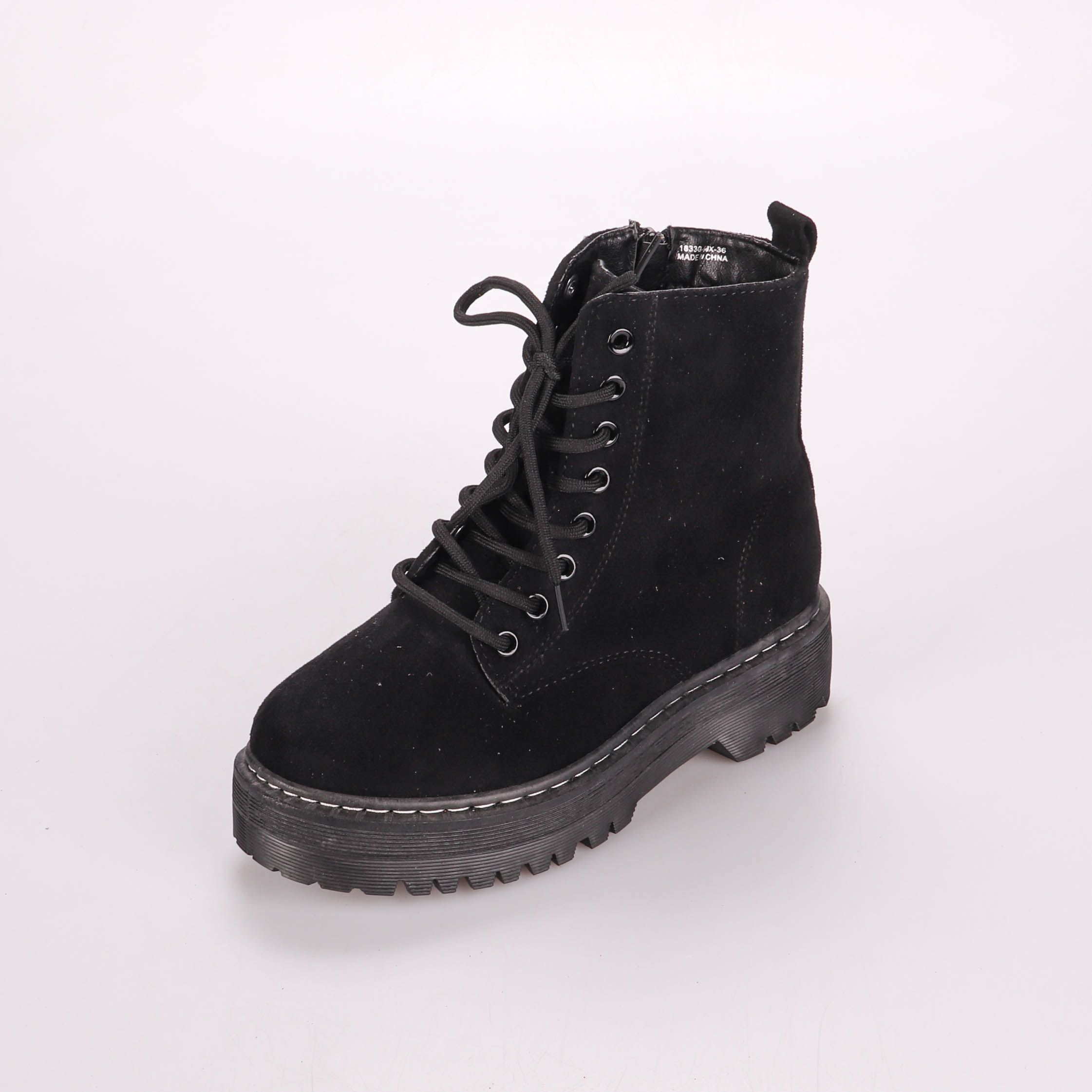 Женские ботинки на шнуровке и с боковой молнией, выполнены в чёрном цвете под замшу. Подойдут для повседневных городских образов в прохладную погоду. Толстая рельефная подошва даёт устойчивость и лучше держит на скользкой поверхности.