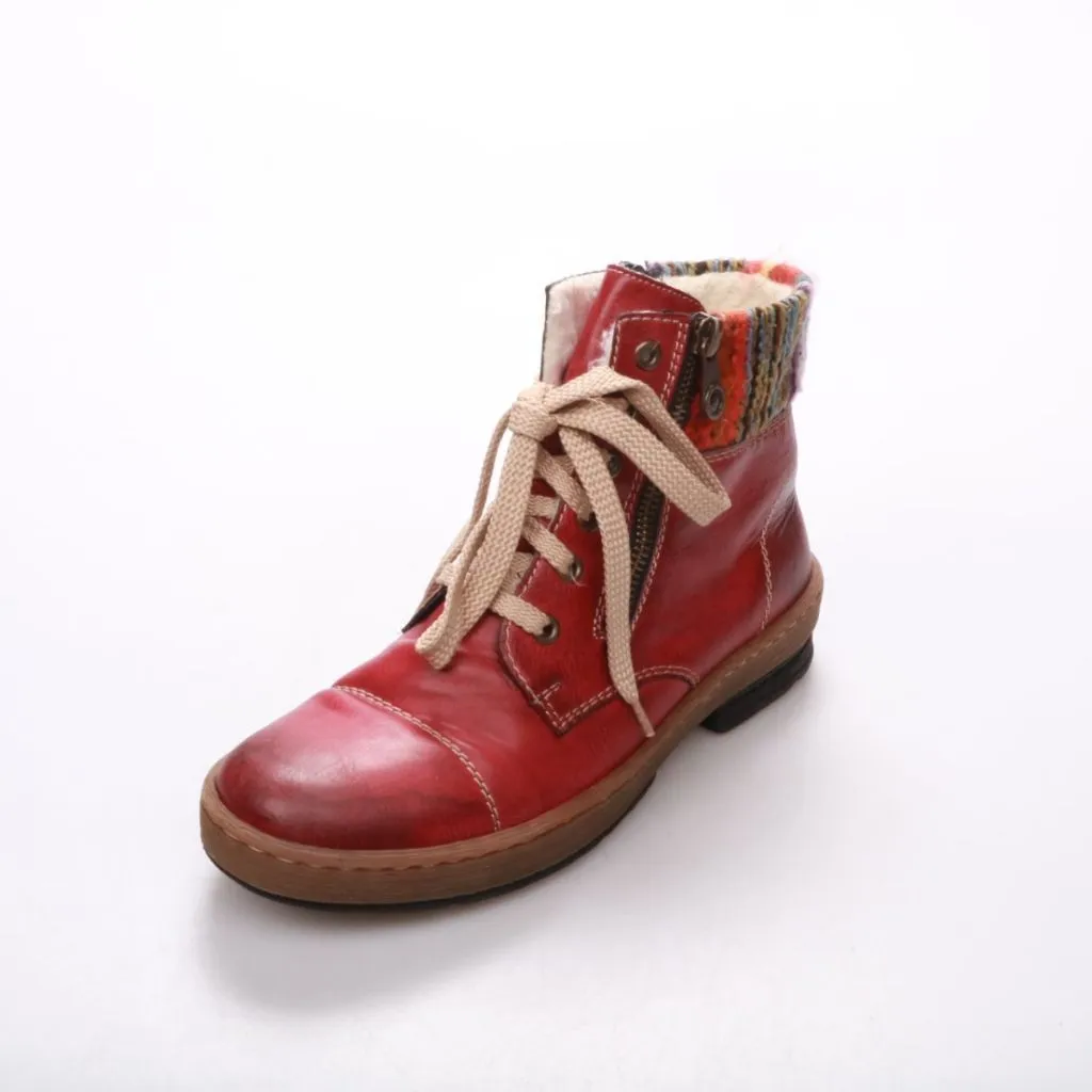 Женские ботинки Rieker из красной кожи с боковой молнией и шнуровкой, с вязаным воротником. Подойдут на каждый день в межсезонье и прохладную погоду. Практичная подошва с протектором даёт устойчивость на мокрых дорожках.