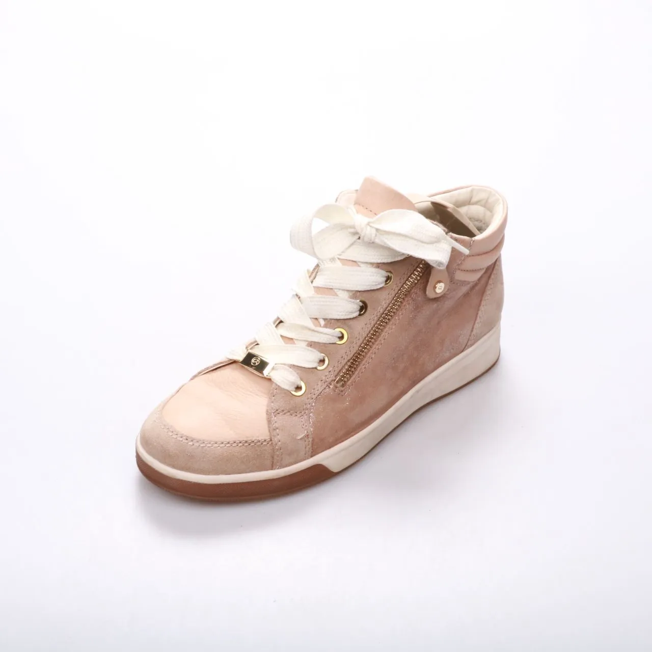 Женские высокие кроссовки ara в пудрово-розовом цвете из сочетания замши и кожи, с боковой молнией и шнуровкой-лентой. Подойдут для повседневных прогулок в межсезонье и прохладную погоду. Молния сбоку упрощает надевание и фиксацию по ноге.