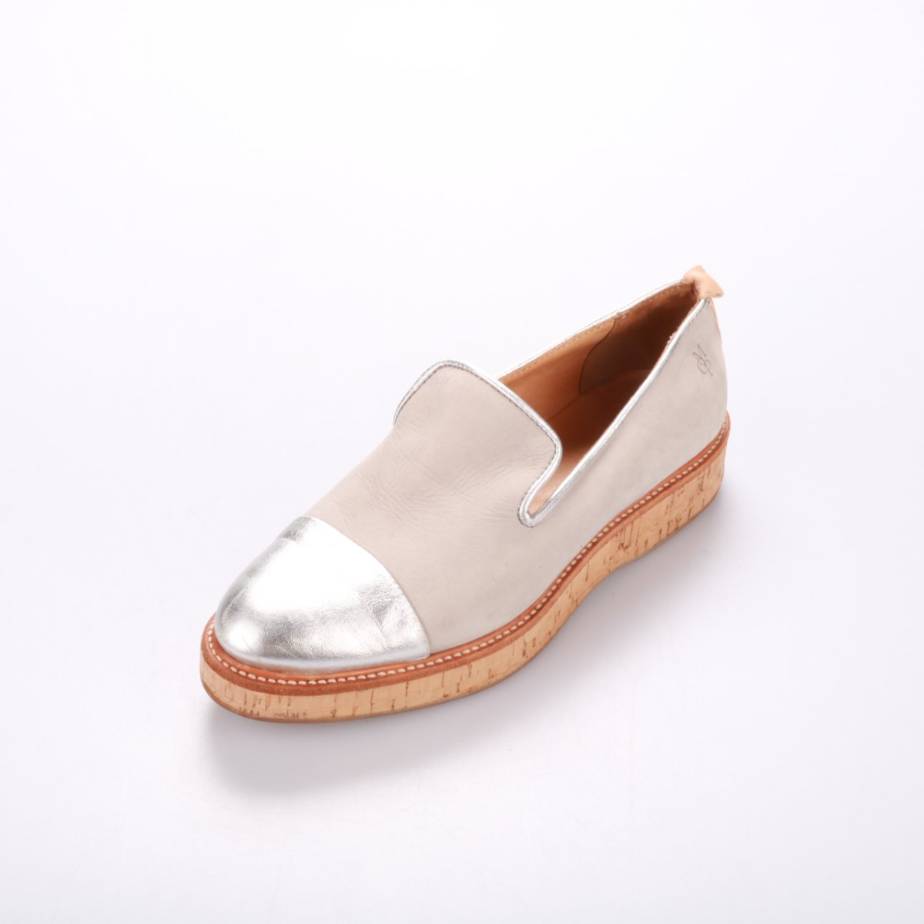 Лоферы Marc O'Polo из натуральной кожи бежевого цвета с серебристым мысом и пробковой подошвой. Подойдут для повседневных образов в межсезонье и прохладным летом. Удобная конструкция slip-on позволяет быстро обуваться без шнуровки.