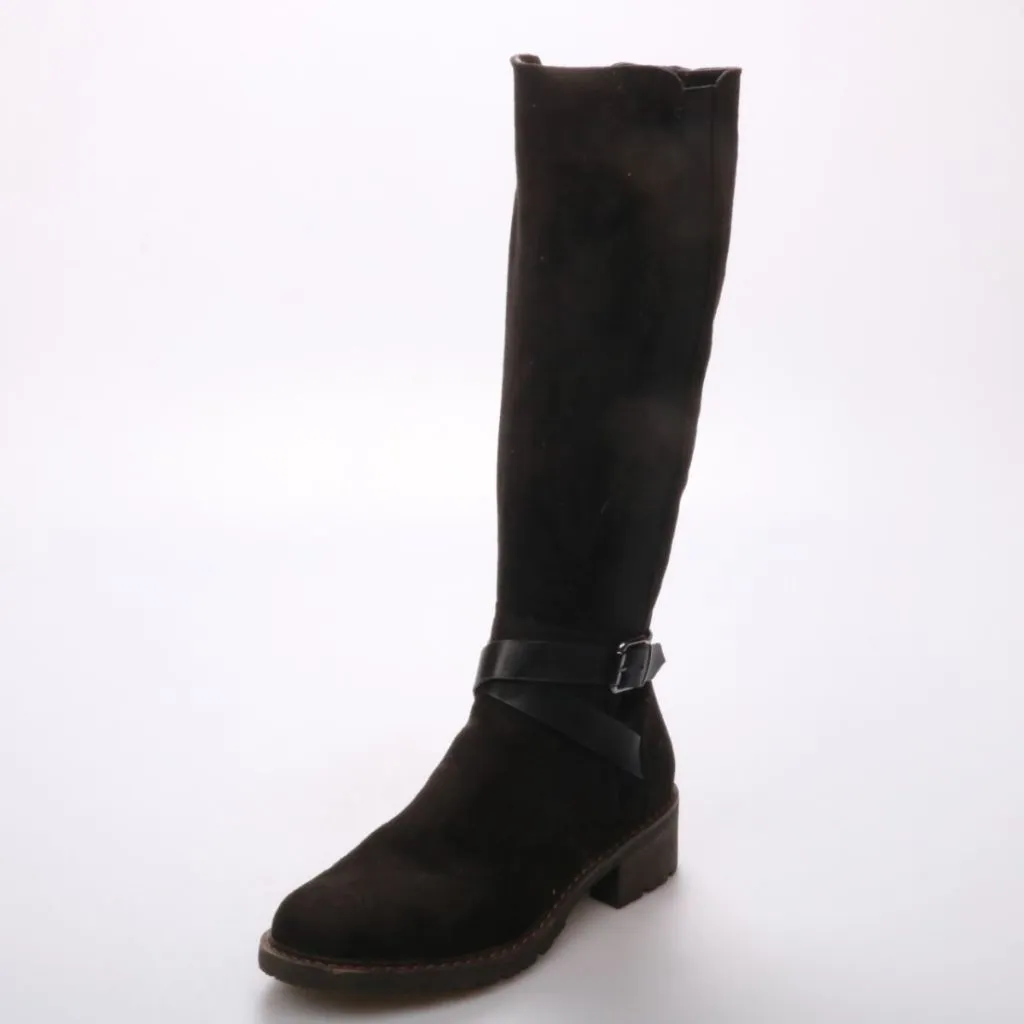 Женские сапоги Graceland из чёрного материала под замшу, с боковой молнией и ремешком с пряжкой. Подойдут для повседневной носки в прохладную погоду и хорошо сочетаются с джинсами и платьями. Устойчивая подошва с протектором даёт лучшее сцепление на мо...