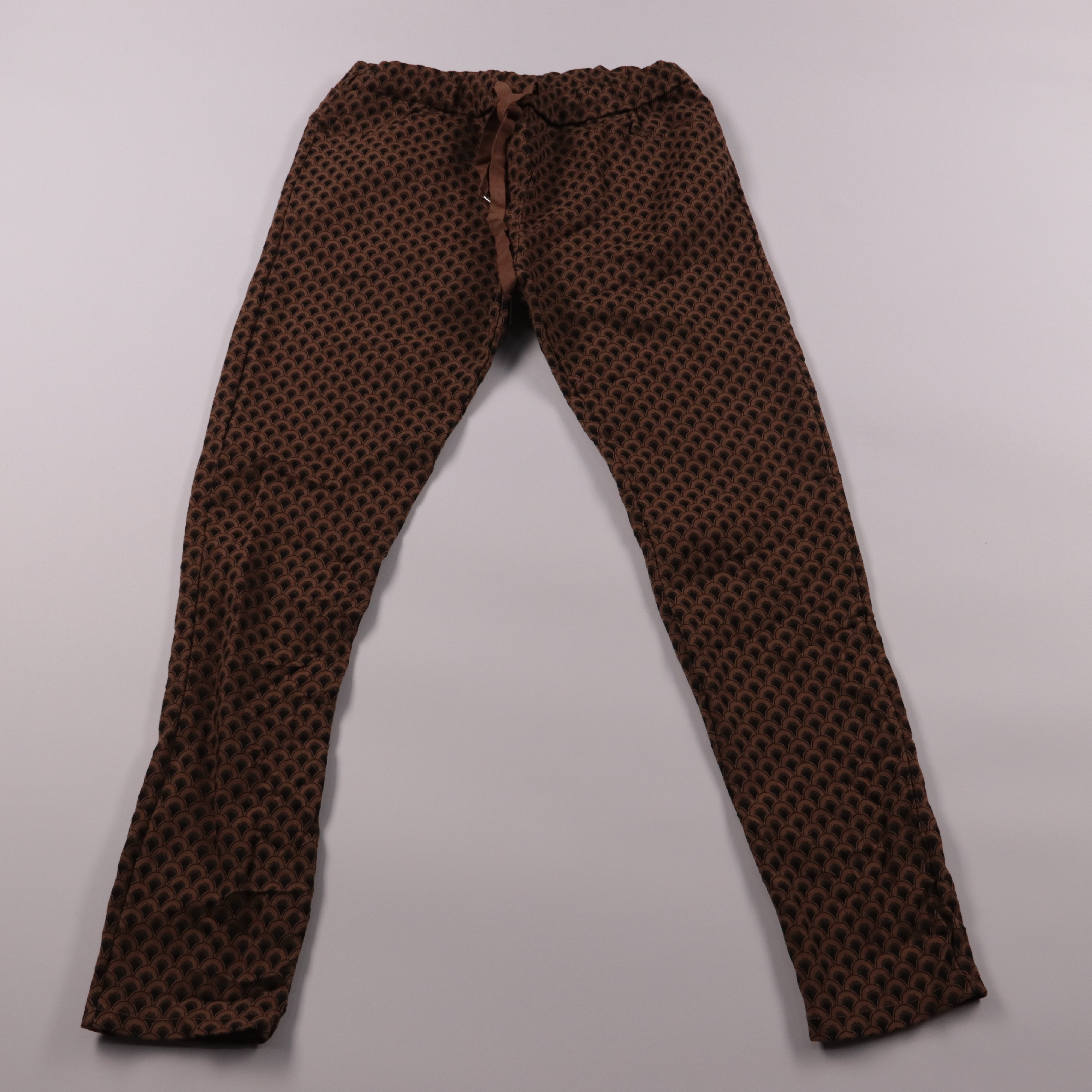 Женские брюки Blanco из плотного жаккарда с геометрическим узором в коричнево‑чёрной гамме и поясом на завязках. Подойдут для повседневных образов и офисного стиля с однотонным верхом. Практичный плюс — ткань держит форму и слегка тянется за счёт эласт...