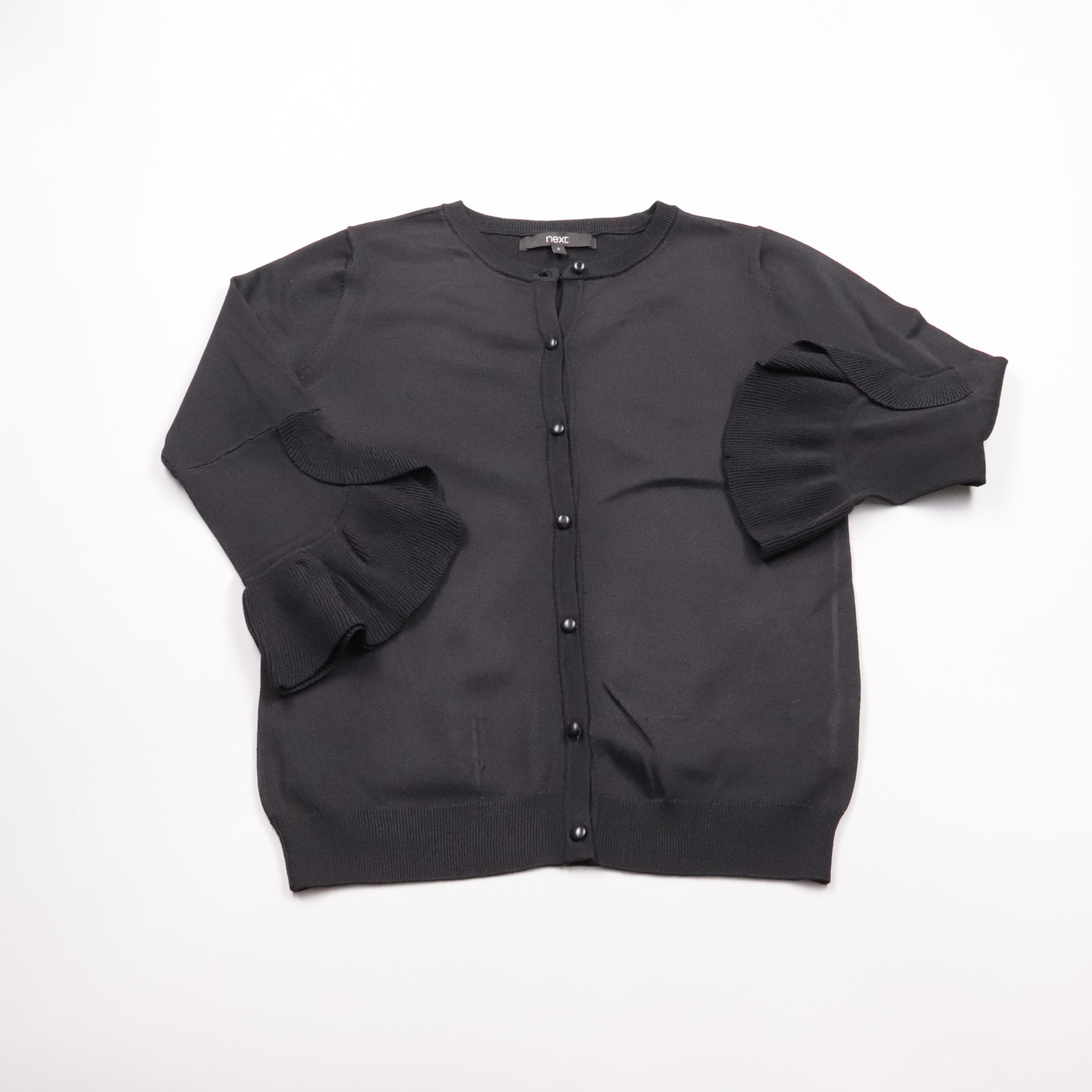 Кардиган Next чёрного цвета на пуговицах, с эффектными рукавами с воланами. Подойдёт для офиса и повседневных образов с платьем, джинсами или юбкой. Тонкий трикотаж удобен для многослойности и не стесняет движений.
