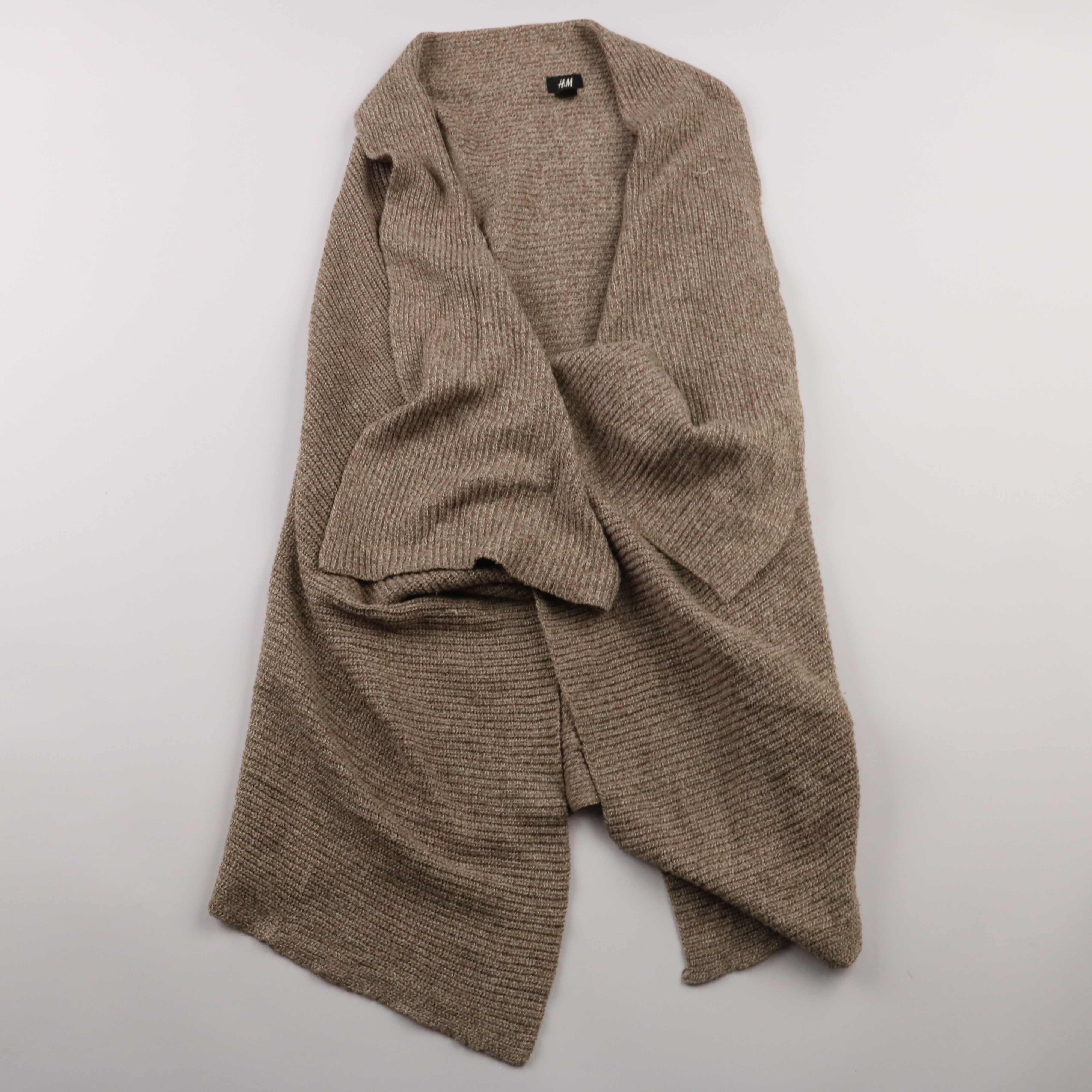 Вязаный кардиган H&M в бежево-коричневом меланжевом оттенке, фактурная вязка и мягкая посадка без застёжки. Подойдёт для прохладной погоды и многослойных образов с джинсами или платьем. Акриловый состав делает вещь лёгкой в уходе и быстро сохнущей.