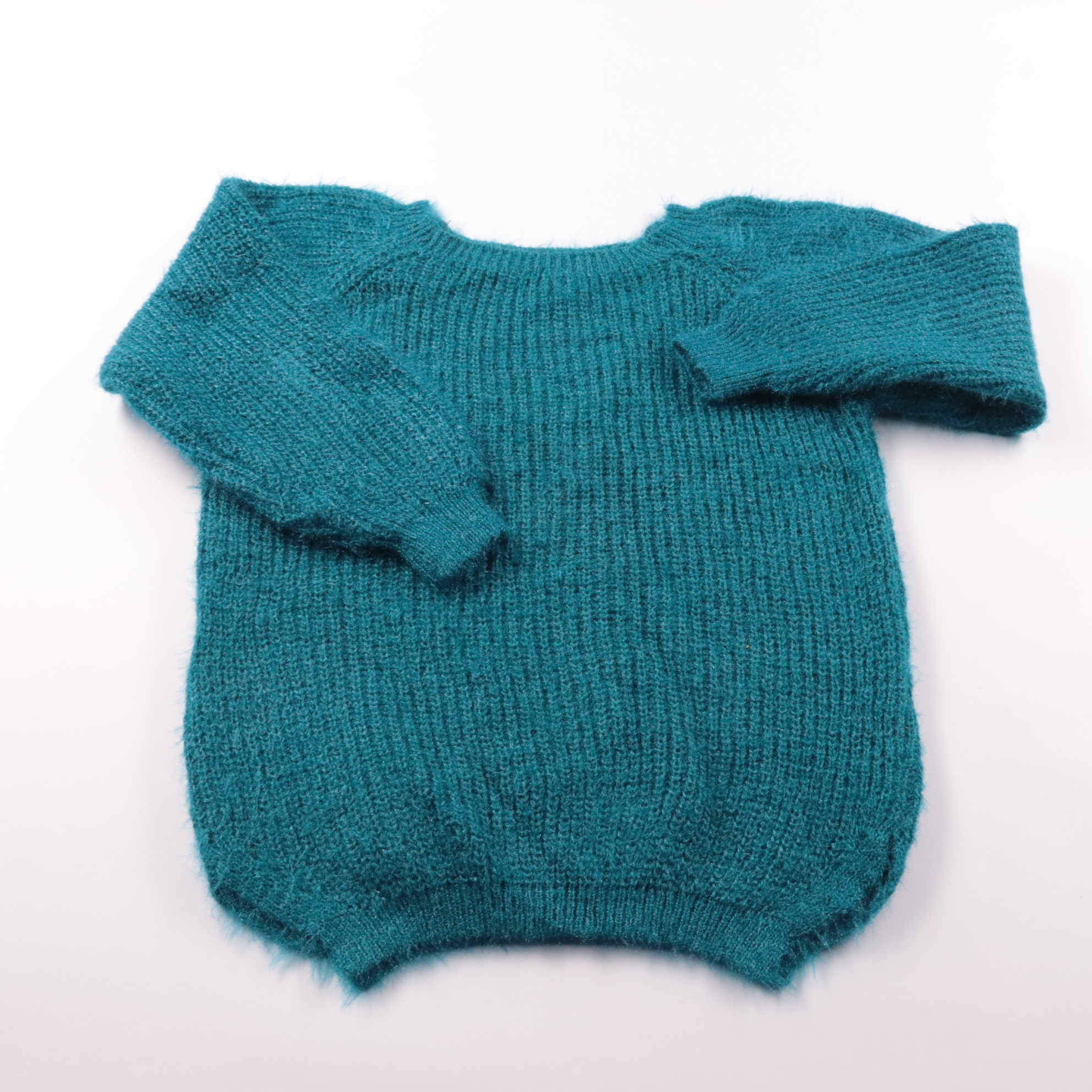 Вязаный свитер без бренда в насыщенном бирюзовом цвете, мягкий и слегка пушистый на ощупь. Подойдёт для прохладной погоды и уютных повседневных образов с джинсами или юбкой. Тёплая фактура хорошо сохраняет тепло и комфортна в носке.