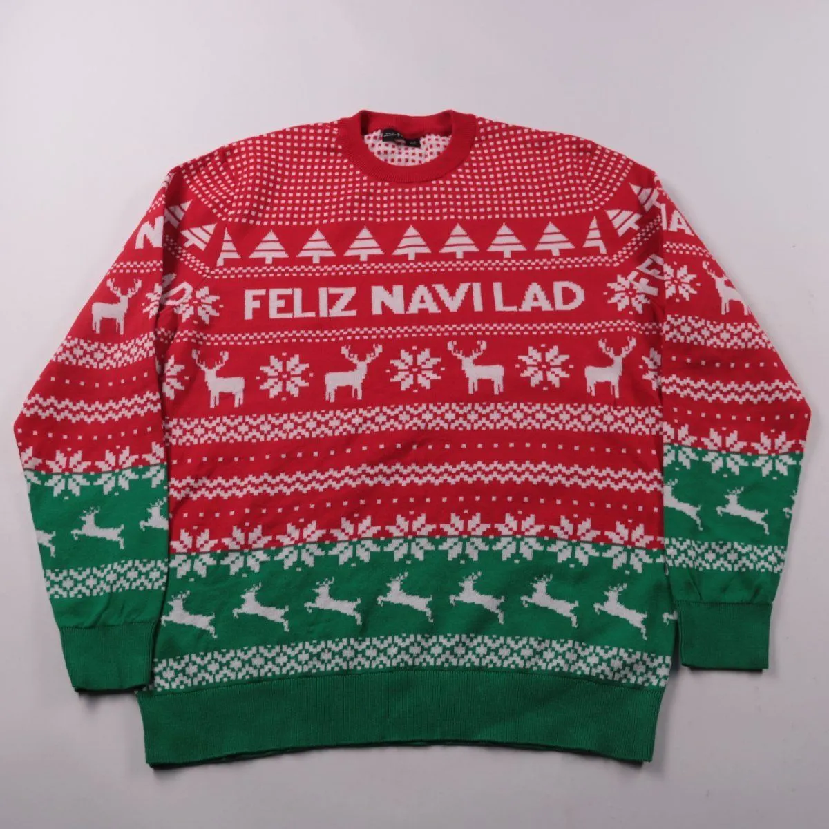 Вязаный свитер F&F с новогодним жаккардовым узором и надписью «FELIZ NAVIDAD» в красно-зелёной гамме. Подойдёт для зимних прогулок и праздничных встреч, хорошо смотрится с джинсами и однотонными брюками. Плотная вязка помогает сохранять тепло и комфорт.