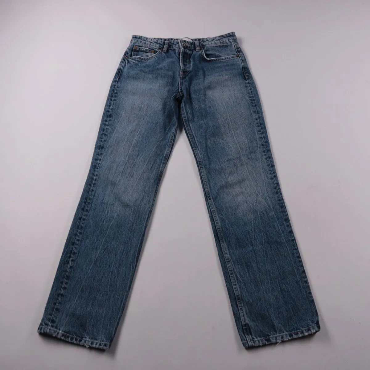 Джинсы Zara из синего денима прямого кроя с классической посадкой и пятью карманами. Подойдут для повседневных образов в любое время года и легко сочетаются с базовым гардеробом. Плотный хлопок хорошо держит форму и устойчив к носке.
