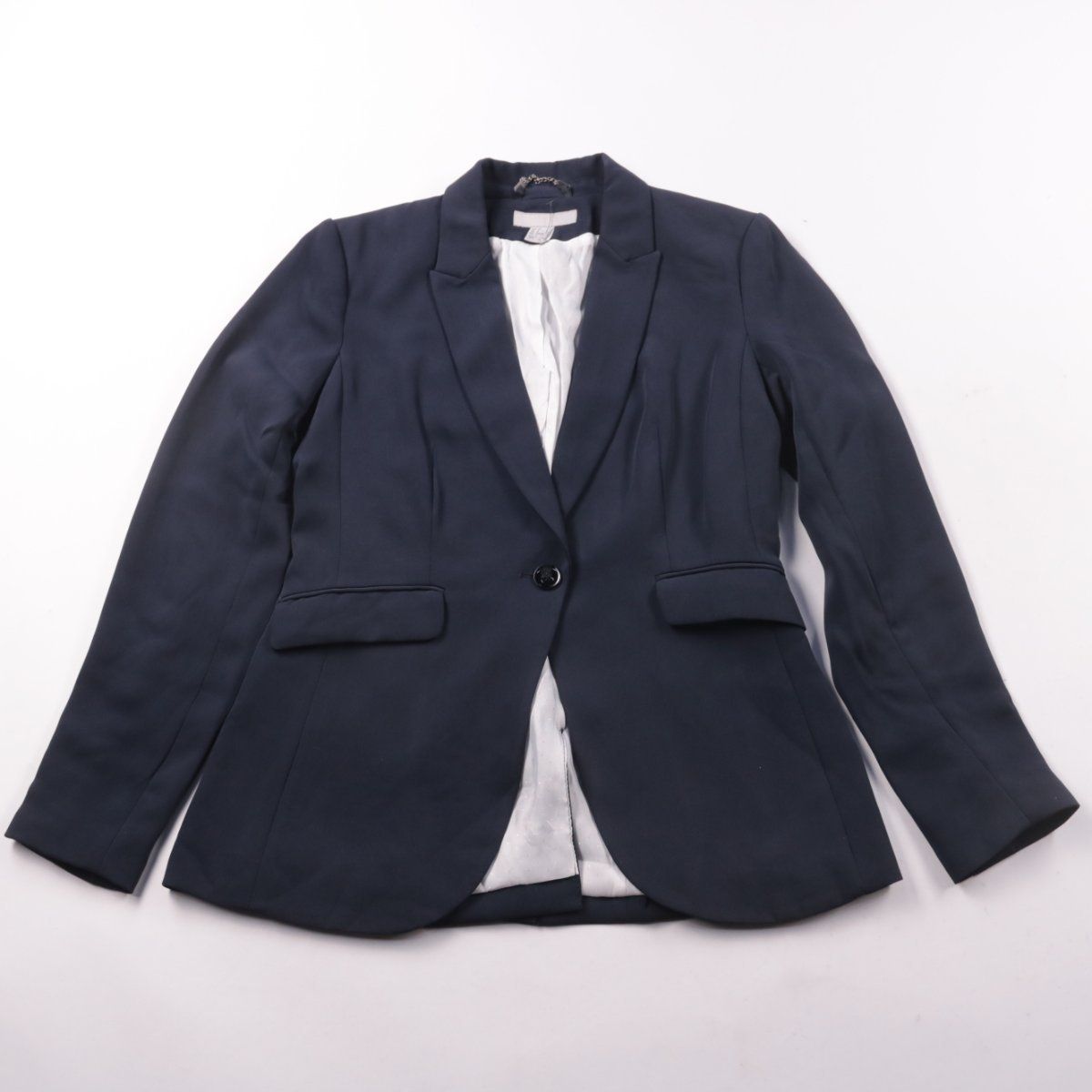 Женский приталенный пиджак H&M тёмно-синего цвета с однобортной застёжкой на одну пуговицу и карманами с клапанами. Подойдёт для офиса и повседневных образов, хорошо сочетается с брюками и юбками. Практичный материал почти не мнётся и прост в уходе.