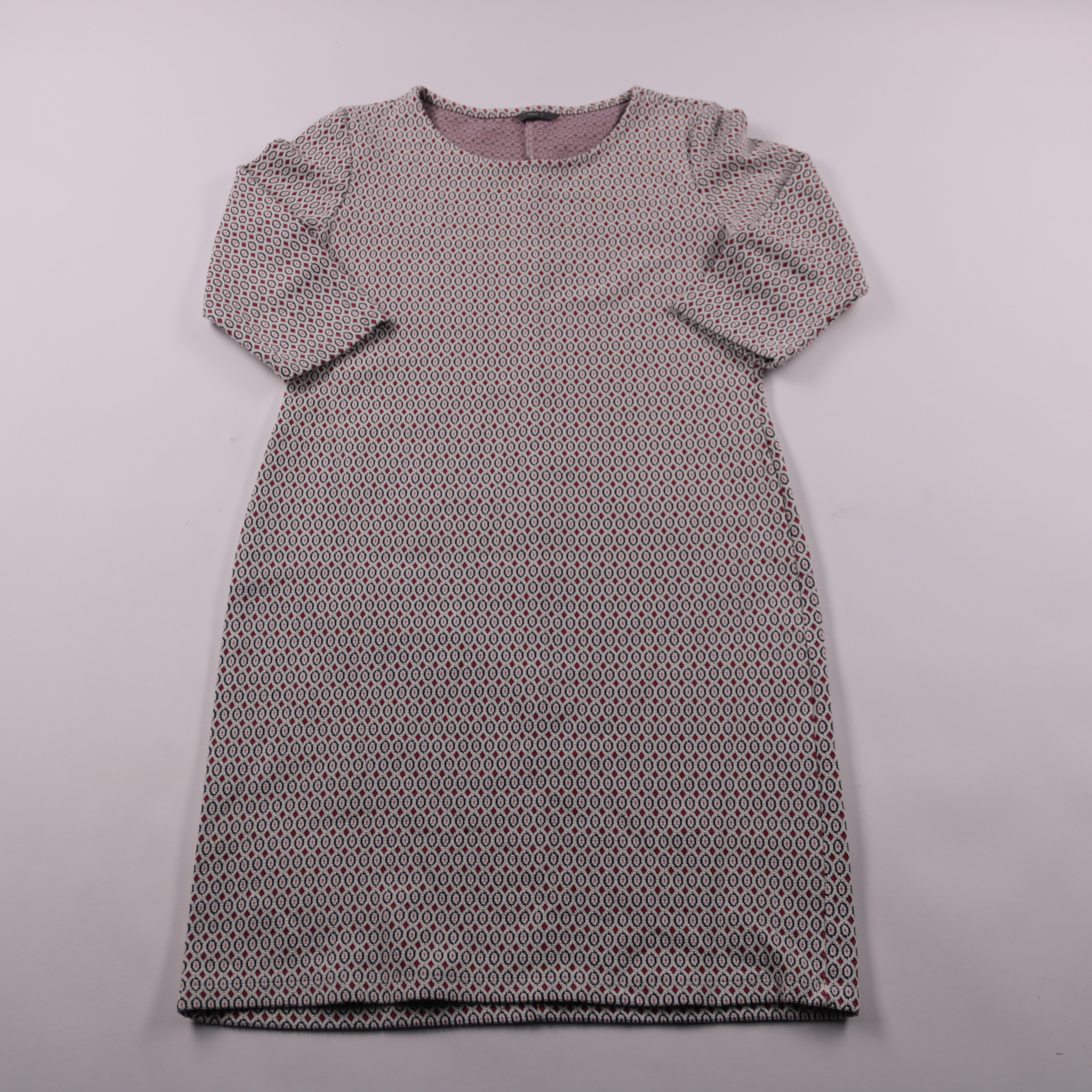 Повседневное платье HEMA прямого силуэта с короткими рукавами и круглым вырезом, ткань с мелким геометрическим принтом. Подойдёт для офиса и на каждый день, легко сочетается с жакетом или кардиганом. Практичный плюс — немнущийся материал и комфортная п...