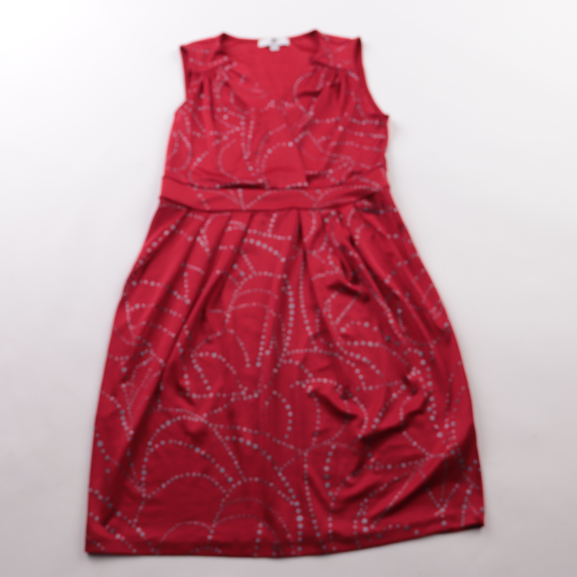 Повседневное платье H без рукавов, красного цвета с узором из точек и мягкими складками на талии. Подойдёт для офиса и встреч, хорошо сочетается с жакетом или кардиганом. Материал с добавлением эластана слегка тянется и комфортно садится по фигуре.