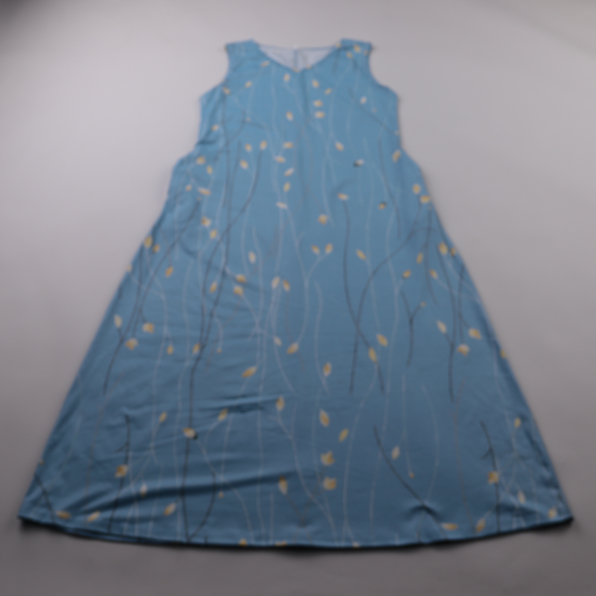 Лёгкое повседневное платье без рукавов в голубом цвете с принтом. Подойдёт для прогулок и отдыха в тёплую погоду. Свободный крой не сковывает движения и удобно носится весь день.