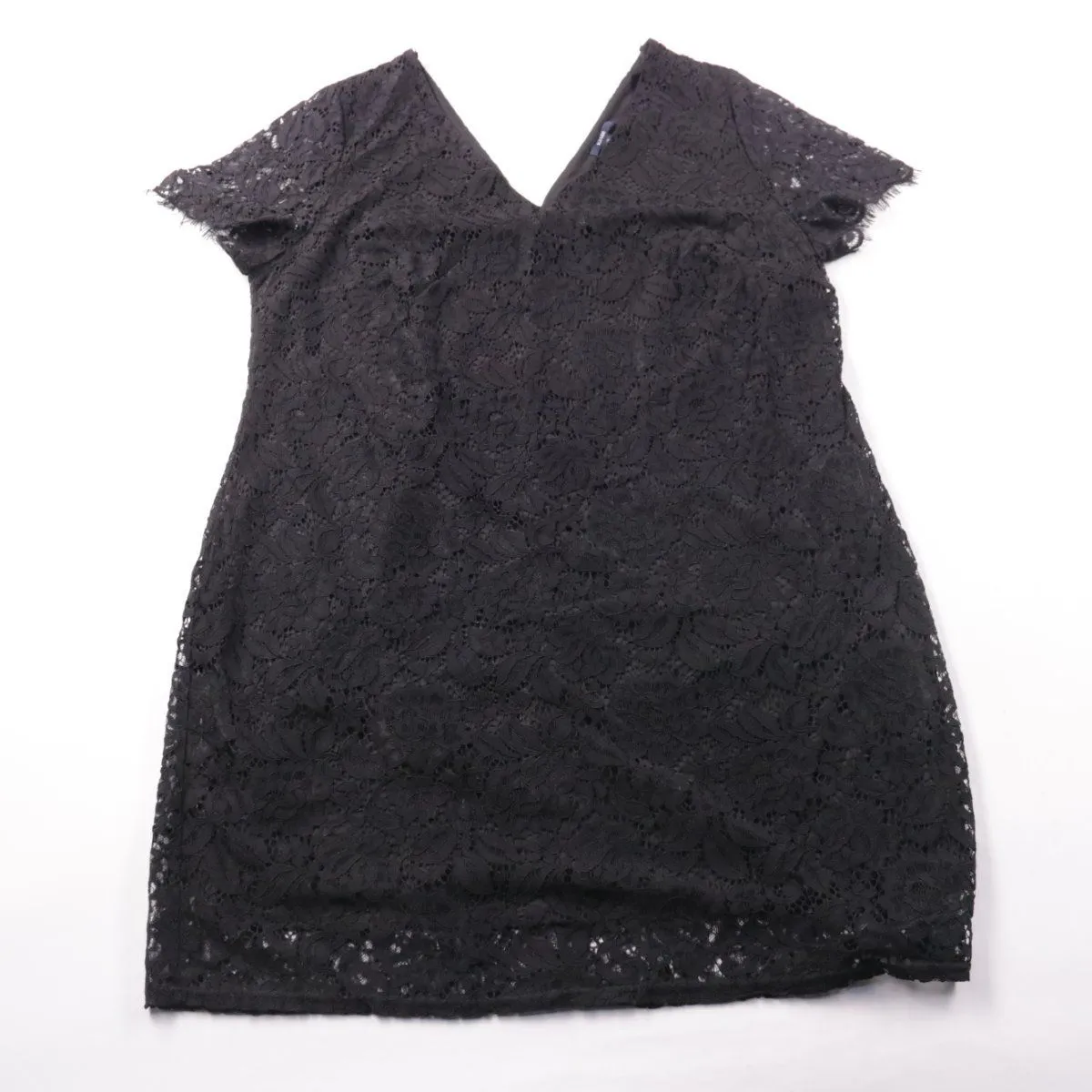 Женское кружевное платье Kiabi чёрного цвета с V-образным вырезом и короткими рукавами. Подойдёт для повседневных выходов и вечерних встреч, легко сочетается с жакетом или кардиганом. Есть подкладка, поэтому кружево не просвечивает и платье комфортно носить.