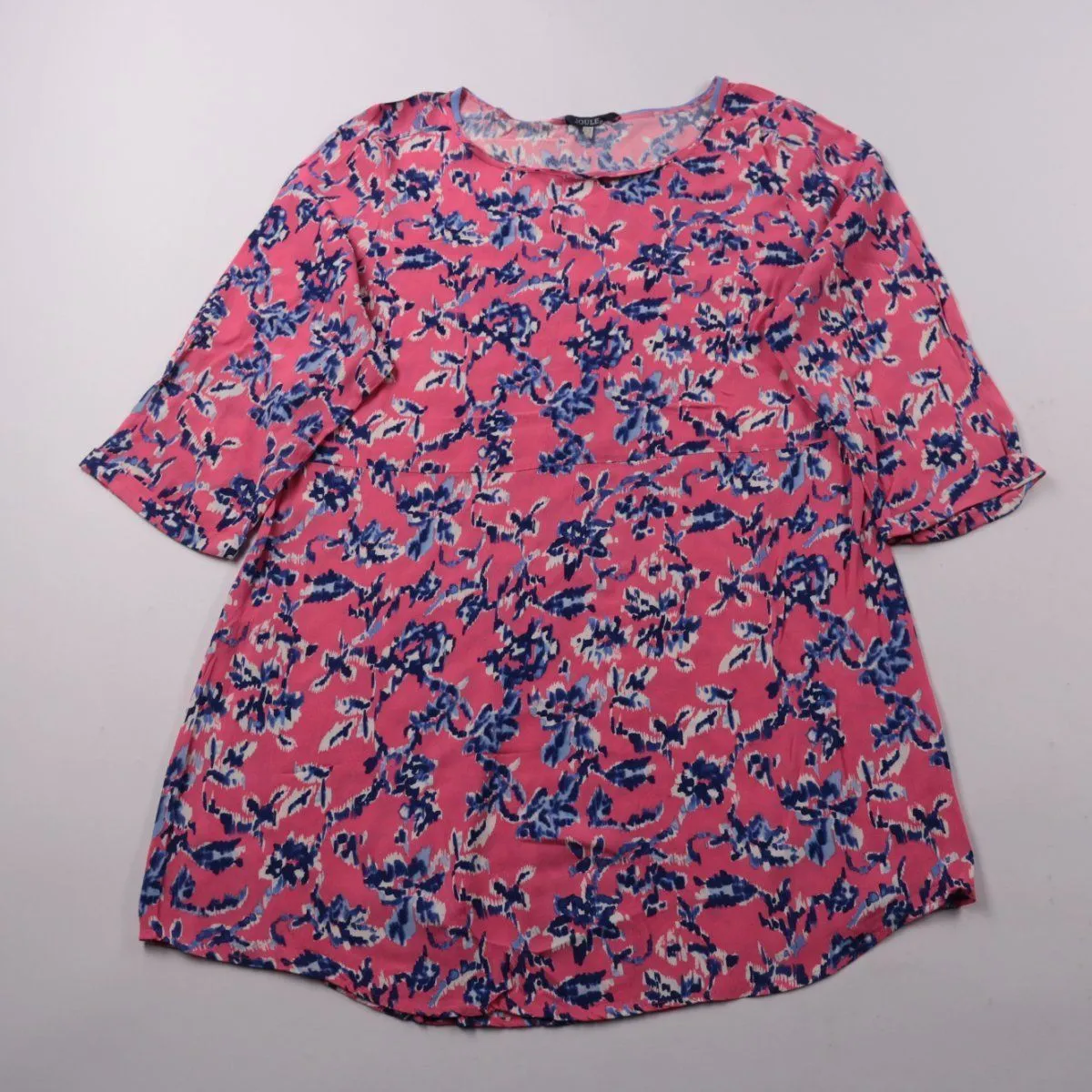 Повседневное платье Joules с цветочным принтом в розово-синих тонах и рукавом 3/4. Подойдёт для летних прогулок и офиса в сочетании с кардиганом. Лёгкая вискоза хорошо дышит и комфортна в носке.