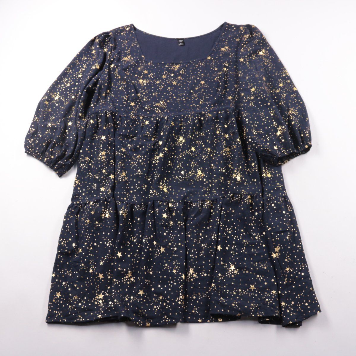 Платье Shein Curve тёмно-синего цвета с золотистым принтом звёзд и ярусным свободным кроем. Подойдёт для повседневных выходов и прогулок, комфортно сидит за счёт объёмных рукавов 3/4. Практично в уходе — ткань из полиэстера легко стирается и быстро сохнет.