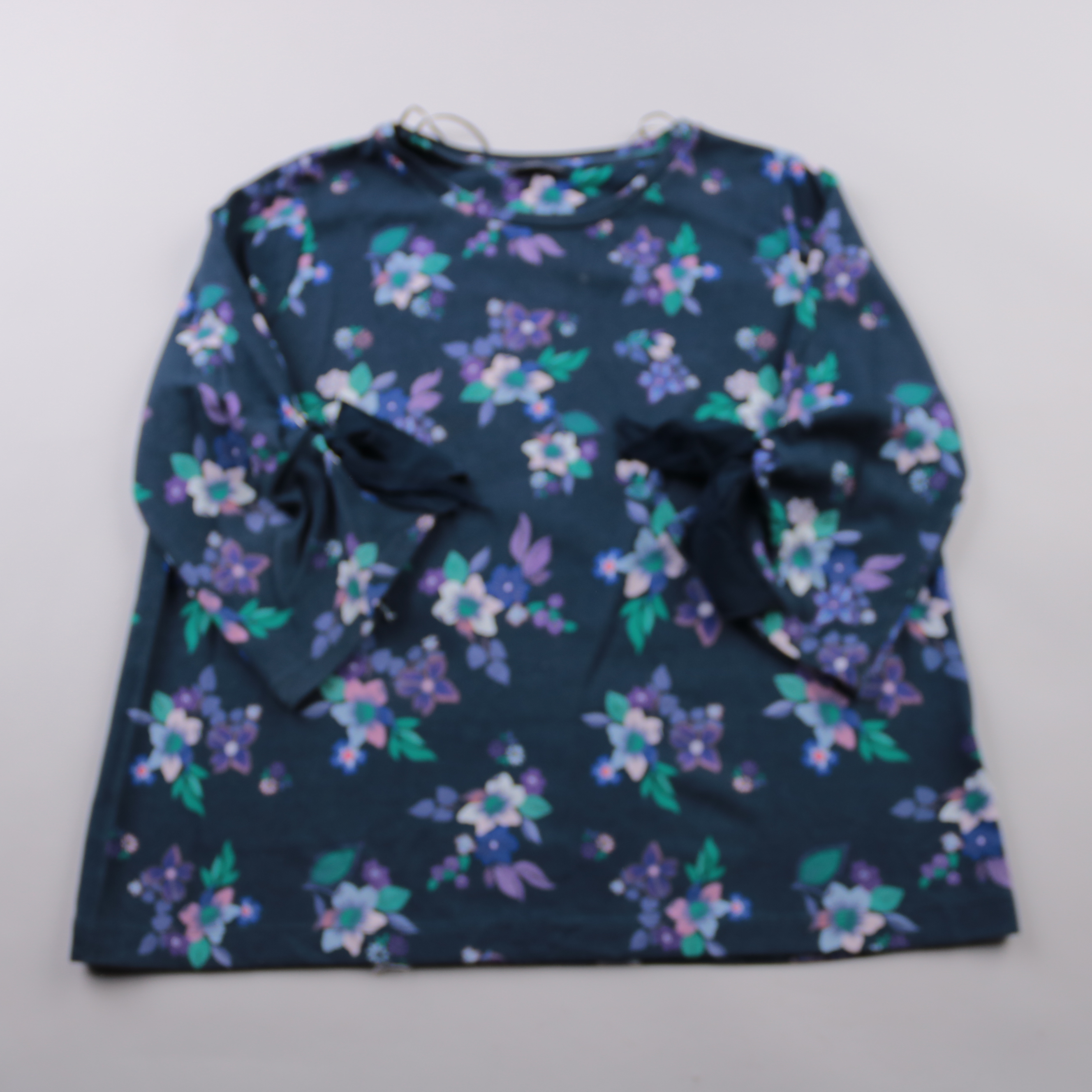 Блузка Yessica тёмно-синего цвета с цветочным принтом и декоративными бантами спереди. Подойдёт для повседневных образов и офиса, хорошо сочетается с джинсами или однотонной юбкой. Ткань мягкая и почти не мнётся, удобно носить в течение дня.