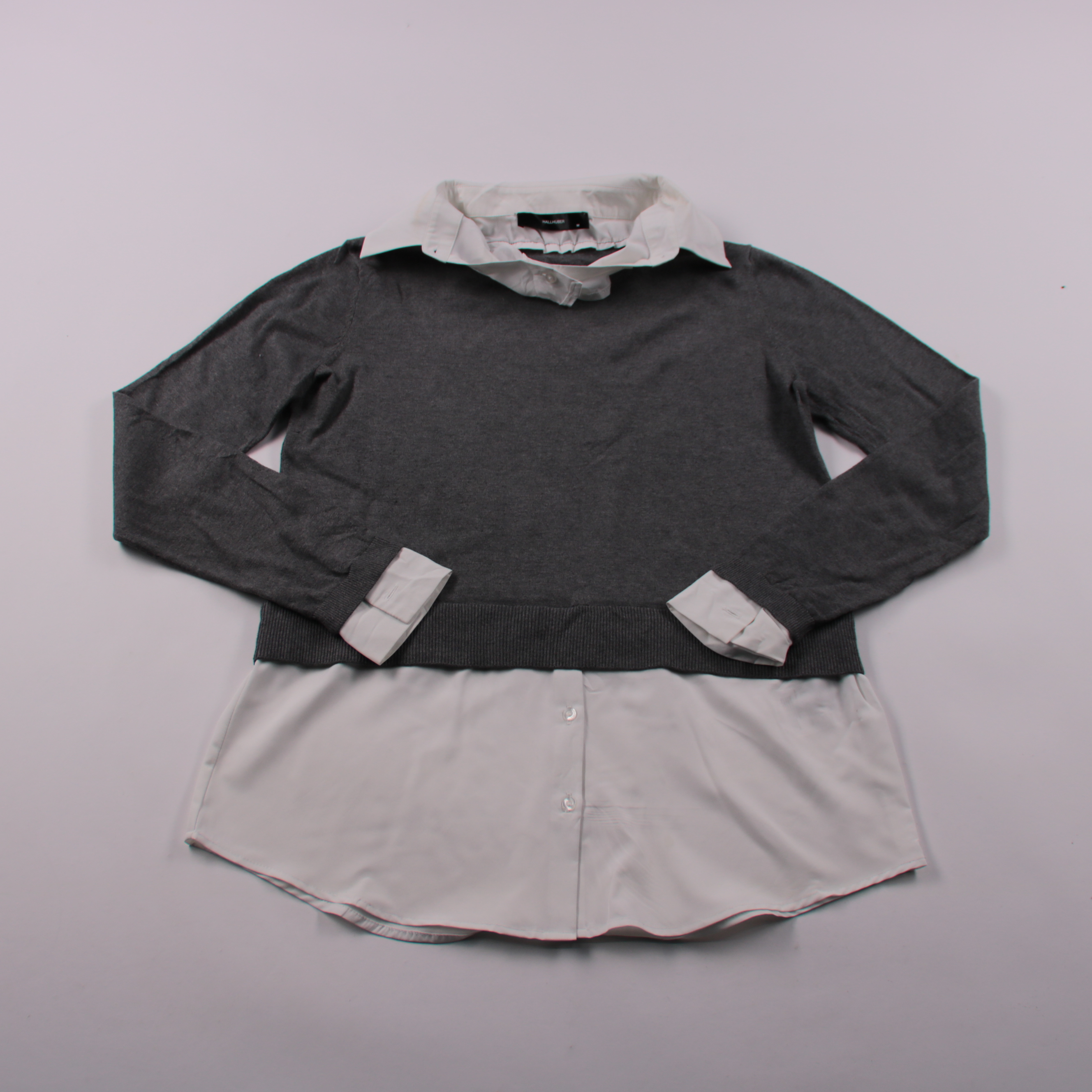 Блузка Hallhuber в многослойном стиле: белая рубашка-имитация под серым джемпером, с воротником и манжетами. Подойдёт для офиса и повседневных образов в прохладную погоду. Практична тем, что выглядит как комплект, но надевается как одна вещь.