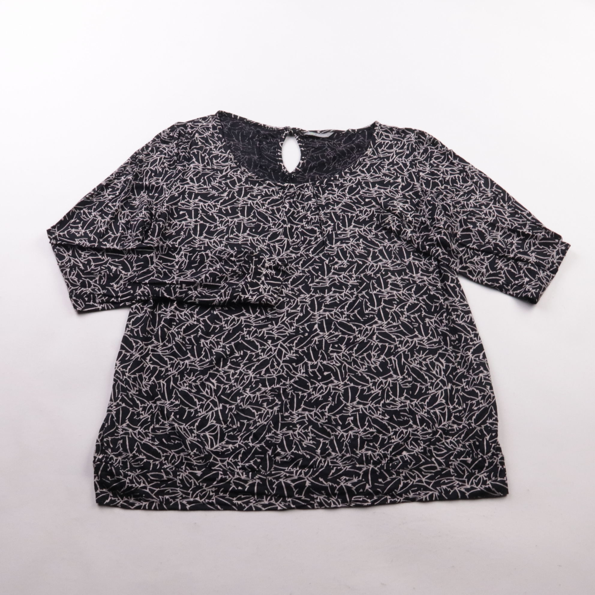 Блузка M&S Woman чёрного цвета с белым графичным принтом и рукавом 3/4, с небольшим вырезом-каплей сзади. Подойдёт для офиса и повседневных образов, хорошо сочетается с брюками и джинсами. Вискоза с добавлением эластана приятно тянется и комфортна в но...