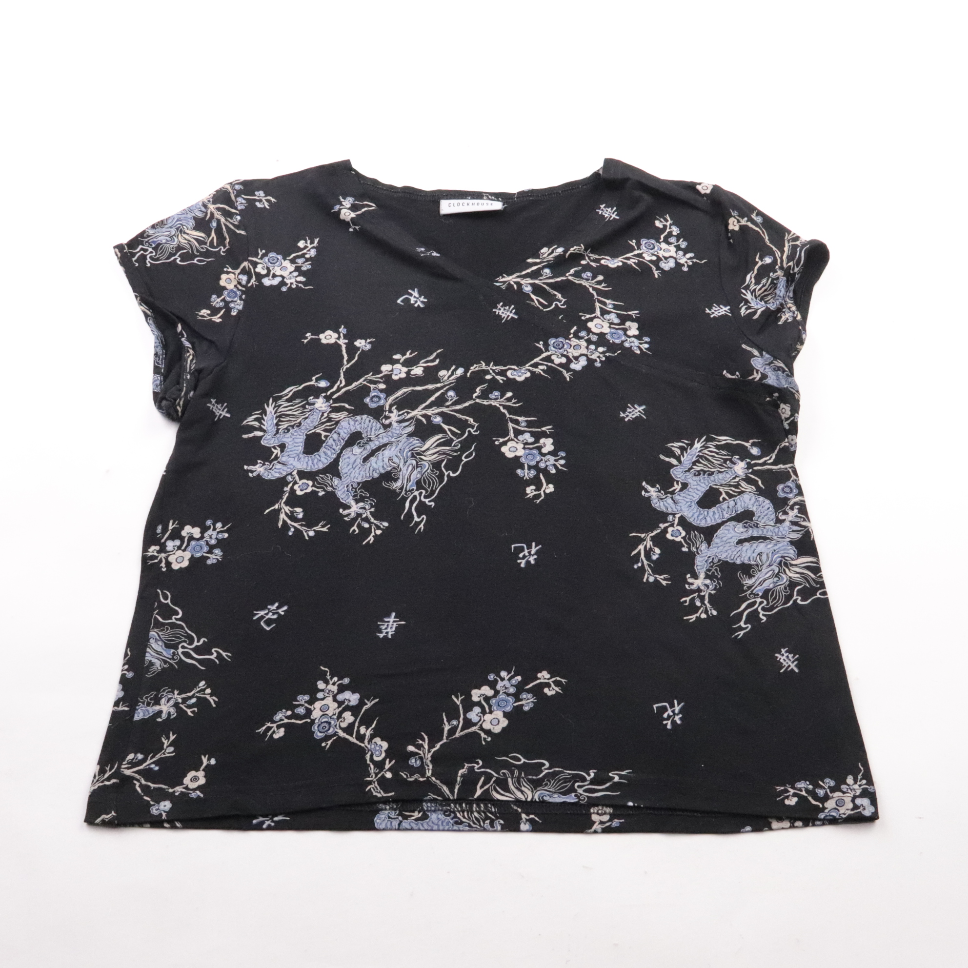 Блузка Clockhouse с V-образным вырезом и коротким рукавом, чёрная с принтом в восточном стиле. Подойдёт для повседневных образов и офиса с жакетом, хорошо сочетается с джинсами и юбками. Ткань мягкая и немного тянется, поэтому комфортно сидит и не сков...