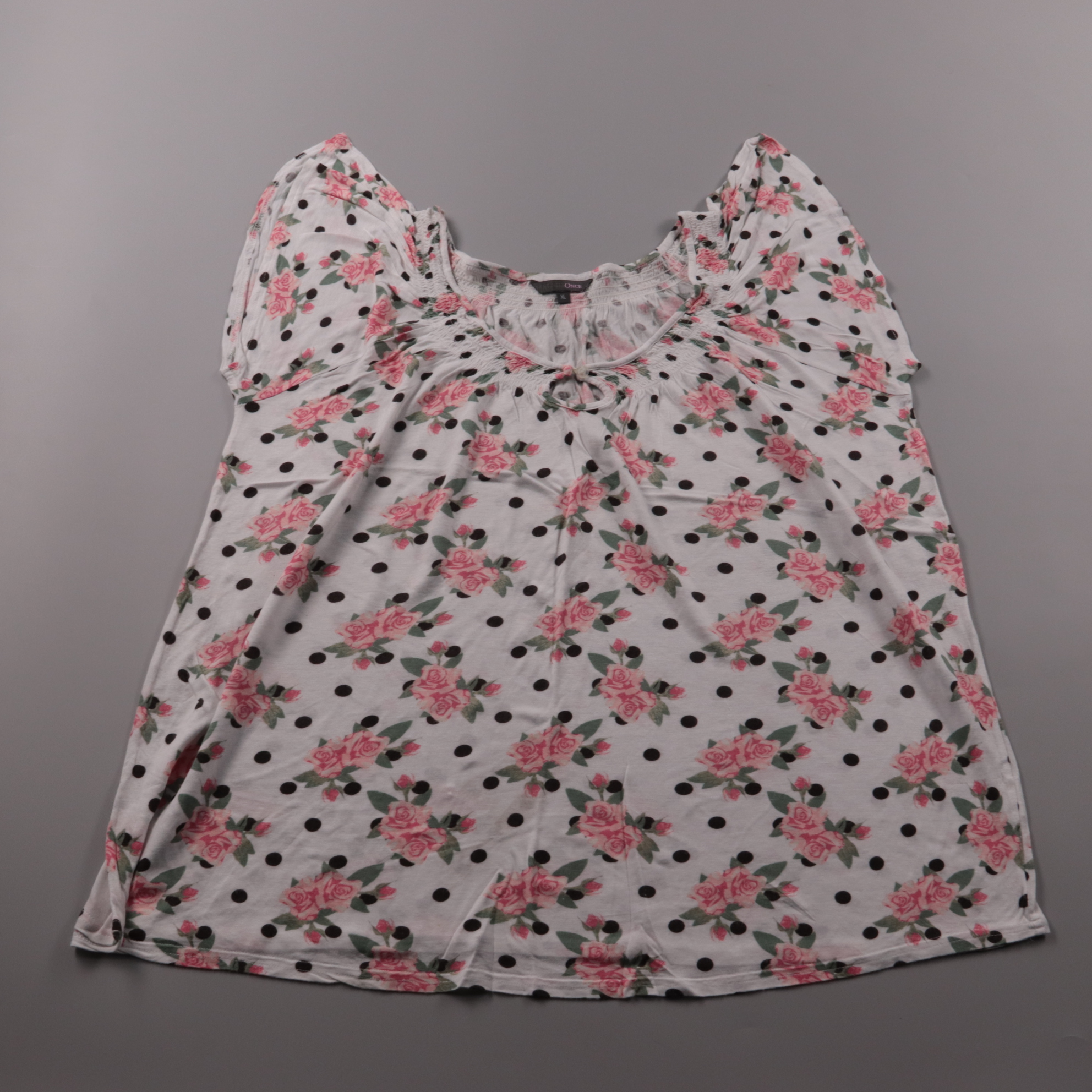 Лёгкая блузка Once из вискозы с принтом в горошек и розами, с коротким рукавом-фонариком и завязкой у горловины. Подойдёт для тёплой погоды и повседневных образов с джинсами или юбкой. Вискоза хорошо дышит и приятна к телу.