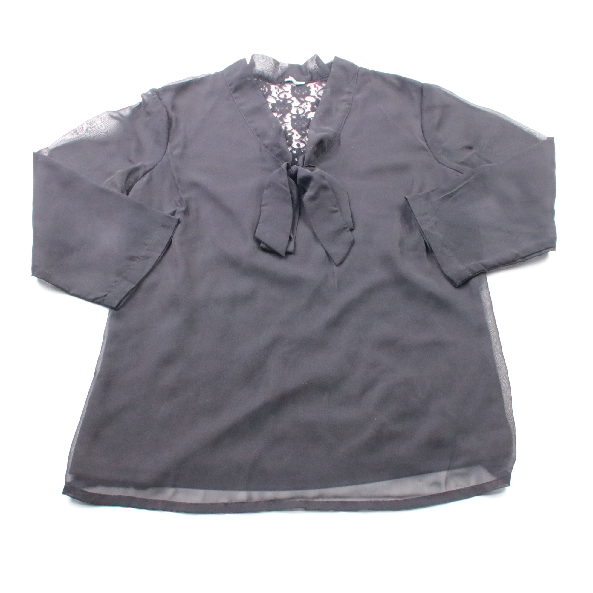 Женская чёрная блузка с V-образным вырезом и завязками-бантом спереди, с полупрозрачными вставками и кружевной спинкой. Подойдёт для офиса и выходов, легко сочетается с брюками или юбкой. Материал лёгкий, почти не мнётся и быстро сохнет после стирки.