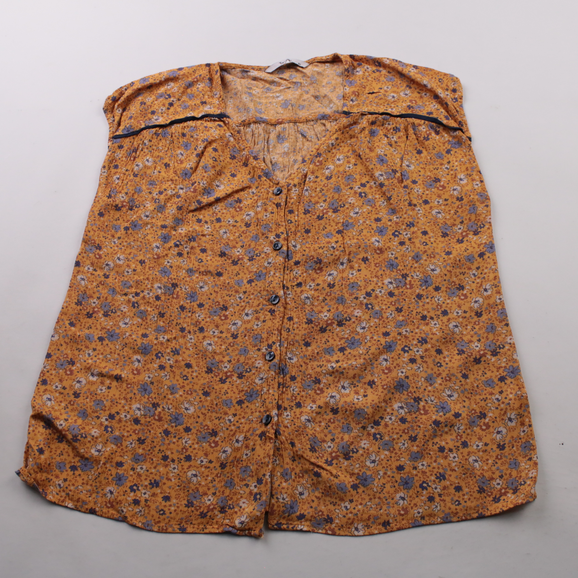 Женская блузка Tu из 100% вискозы, горчичного цвета с мелким цветочным принтом и застёжкой на пуговицы. Подойдёт для лета и тёплой весны, хорошо сочетается с джинсами или юбкой. Лёгкая ткань дышит и комфортна в жару.